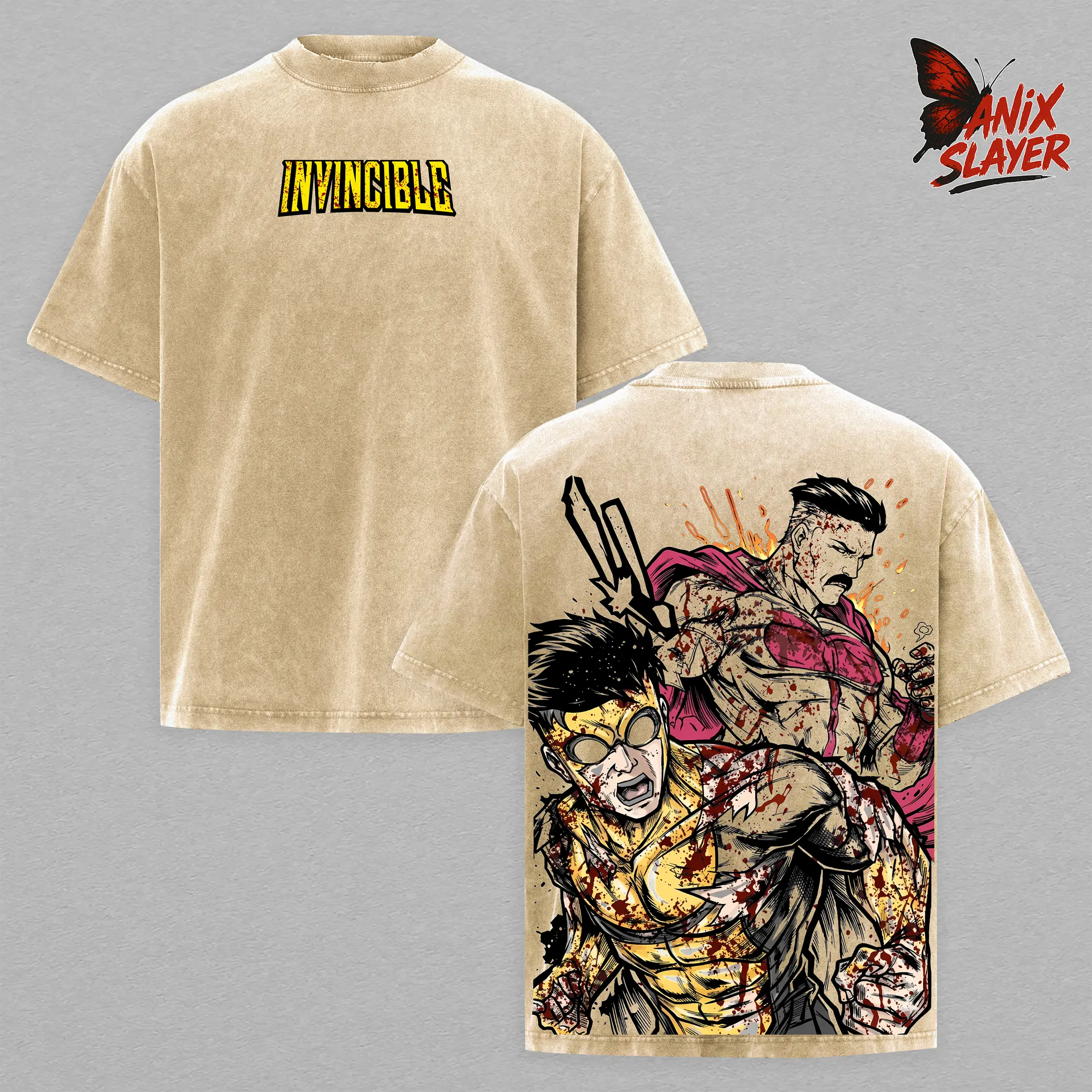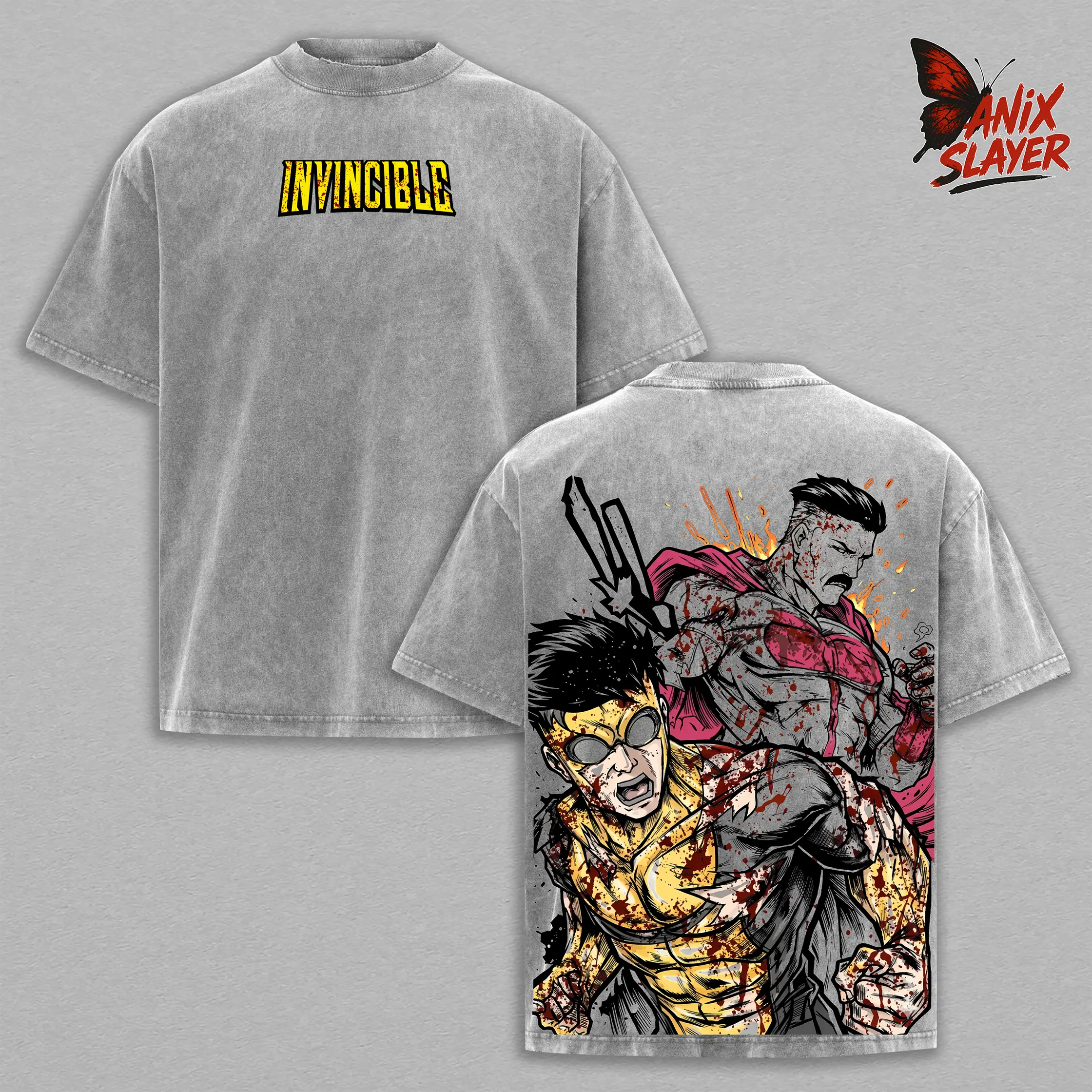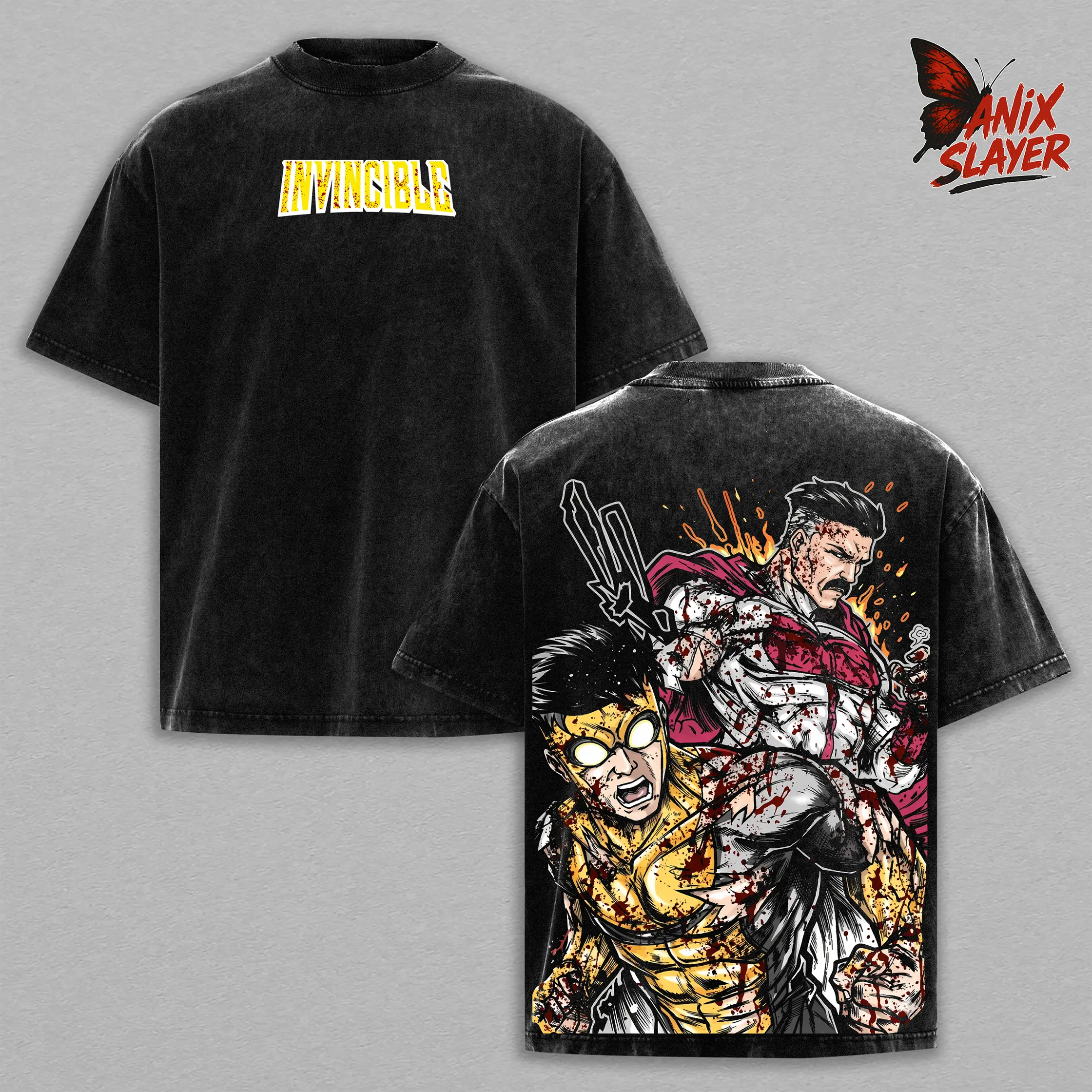 Omni Man vs Mark Grayson, Invincible T-Shirt Vintage Washed Oversized Heavy Cotton Graphic Tee, Superhero Comic Battle Streetwear Shirt, Dark Blood Fight Back Print Tee, Unisex Gym Pump Cover Gamer Streetwear Outfit, Gift For Anime Comic Fans