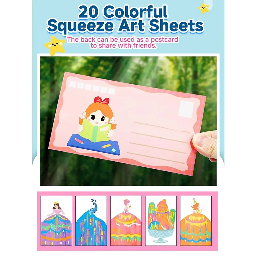 Rainbow Squeeze Art Kit - Creative Scratch & Color Art Set for Kids with 20 Drawing Papers 7 Acrylic Paints 6 Watercolor Pens 1 Sticker Sheet & Squeegee Board Perfect for DIY Art & Gifts