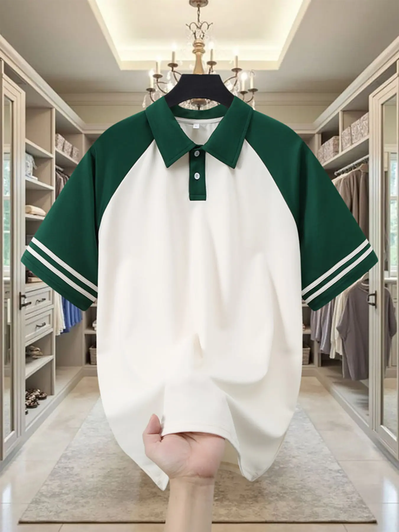 5. American Vintage Colorblock Shoulder Pad Polo Shirt, College Style Striped Short Sleeve, Casual Sporty Contrast Top, Unisex Loose Fit