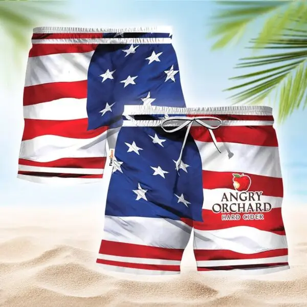USA Tropical Flag Busch Light Swim Trunks – Patriotic Beer Lover Summer Beach Shorts, American Flag Tropical Pool Party Swimwear for Men, Vacation Outfit