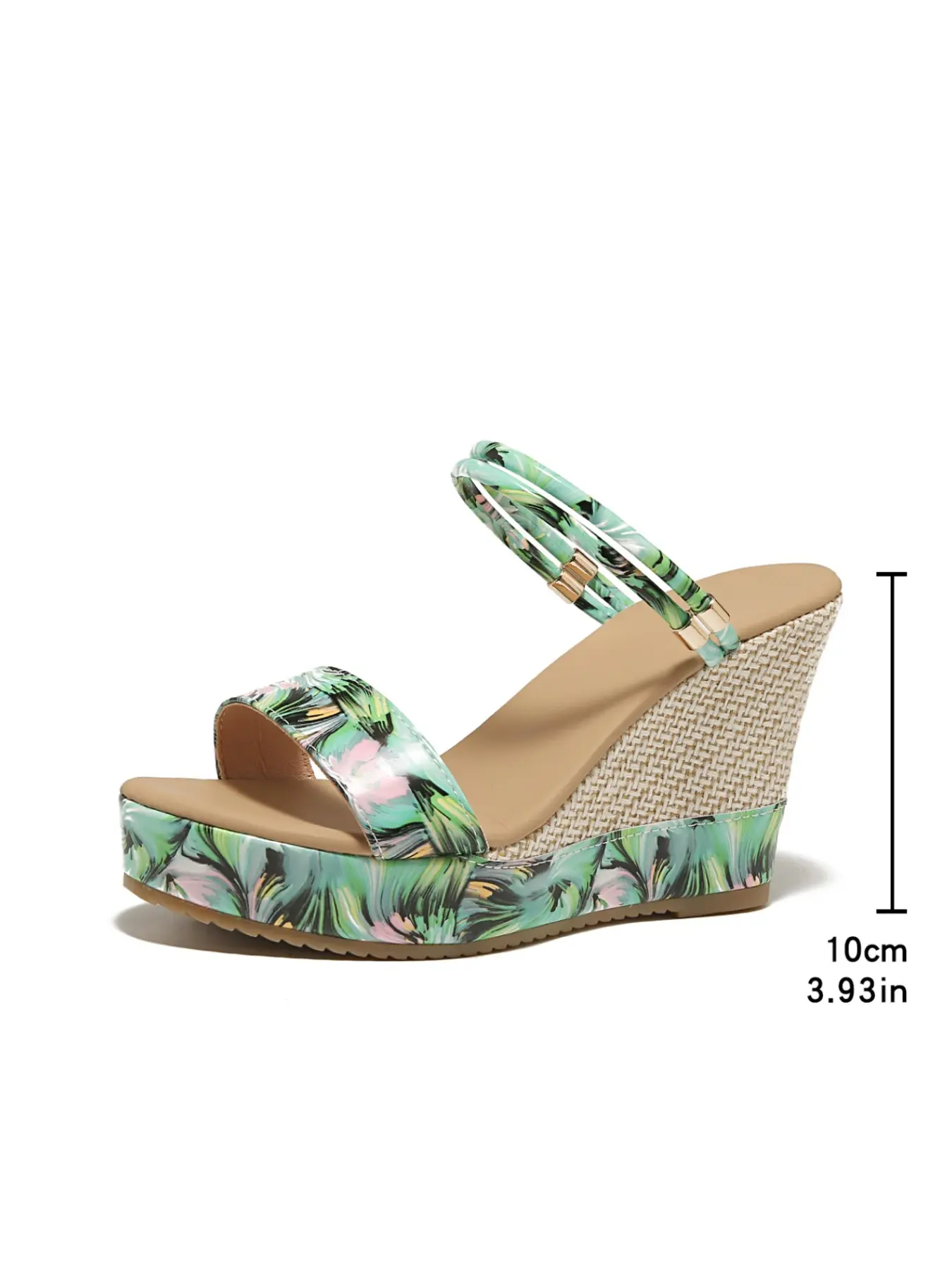 Women's Boho Floral Wedge Sandals, PU Leather, Rubber Sole, All over Print, Thick Sole, Daily/date/commute/vacation, Elegant Outdoor Shoes