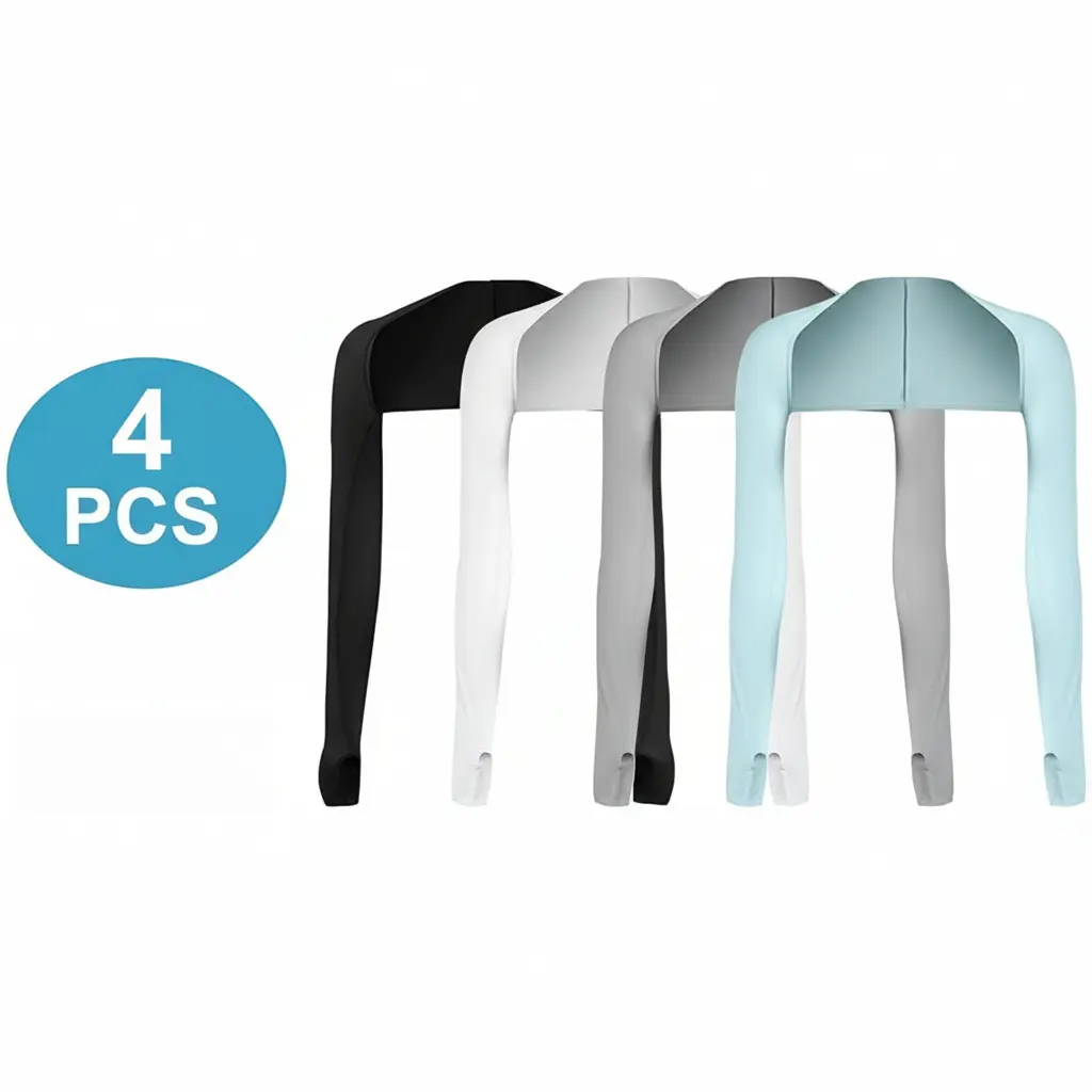 4 cooling shawl arm sleeves in stylish colors: black, white, grey, and blue. Perfect for daily rotation or as replacements during summer. These versatile sleeves not only provide reliable sun protection but also complement a wide range of outfits, keeping you stylish outdoors.