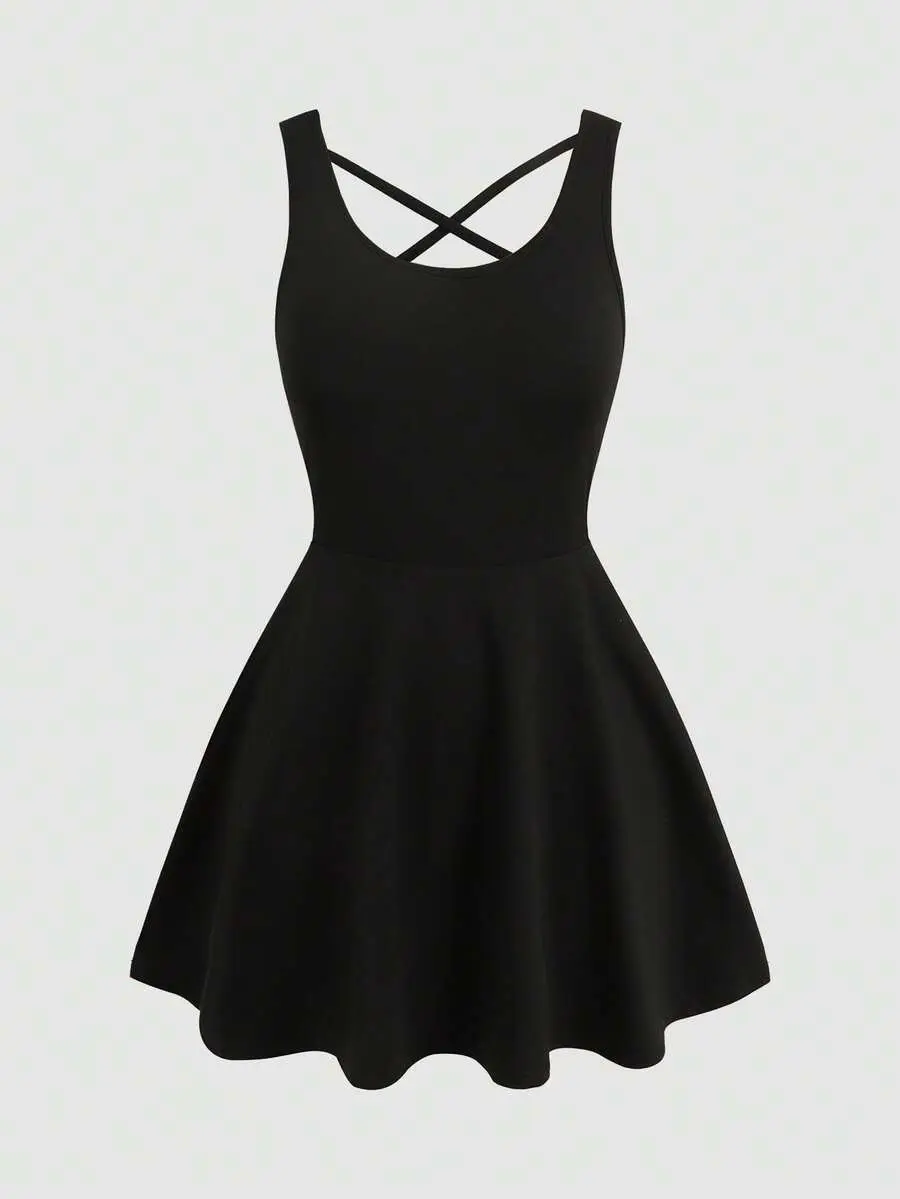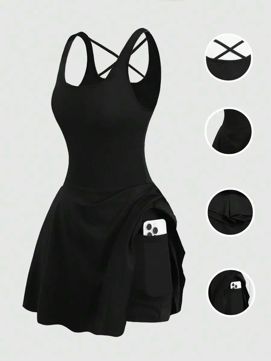 DORRIS Black Knit High Stretch Sleeveless Camisole Criss-Cross Back Design With Leggings, Jumpsuit For Sports, Yoga, Casual Athletic Dress Tennis Dress Workout Dress Dress With Pockets Active Dress
