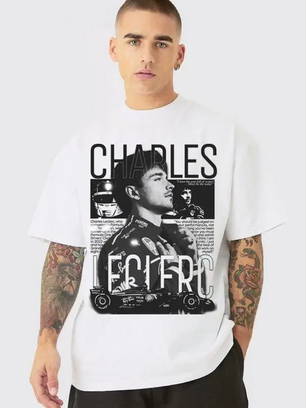 5. Charles Leclerc Editorial Graphic T-Shirt Full Logo, Vintage Racing Driver Print Tee, Monochrome Streetwear Shirt