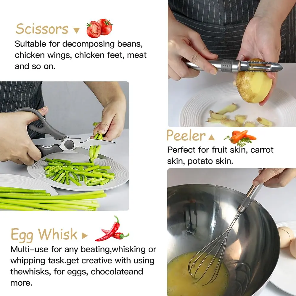 ·33 COOKING UTENSILS - Utensil Set includes everything you need to cook that perfect dish,includes Slotted Spatula ,Slotted Spoon,Flexible Spatula,Slotted Turner, Solid Turner, Pasta Server,Solid Spoon, Kitchen Tongs, Draining Spoon, Whisk ,Deep Soup Ladle,Spatulas,Brush,Peeler,Pizza Cutter,Bottle Opener,Potato,Pusher,Ice-cream spoon,Can opener,Grater,Scissors,measuring cups and spoons set,Small Brush,,Small spatula,Spatula,Holder