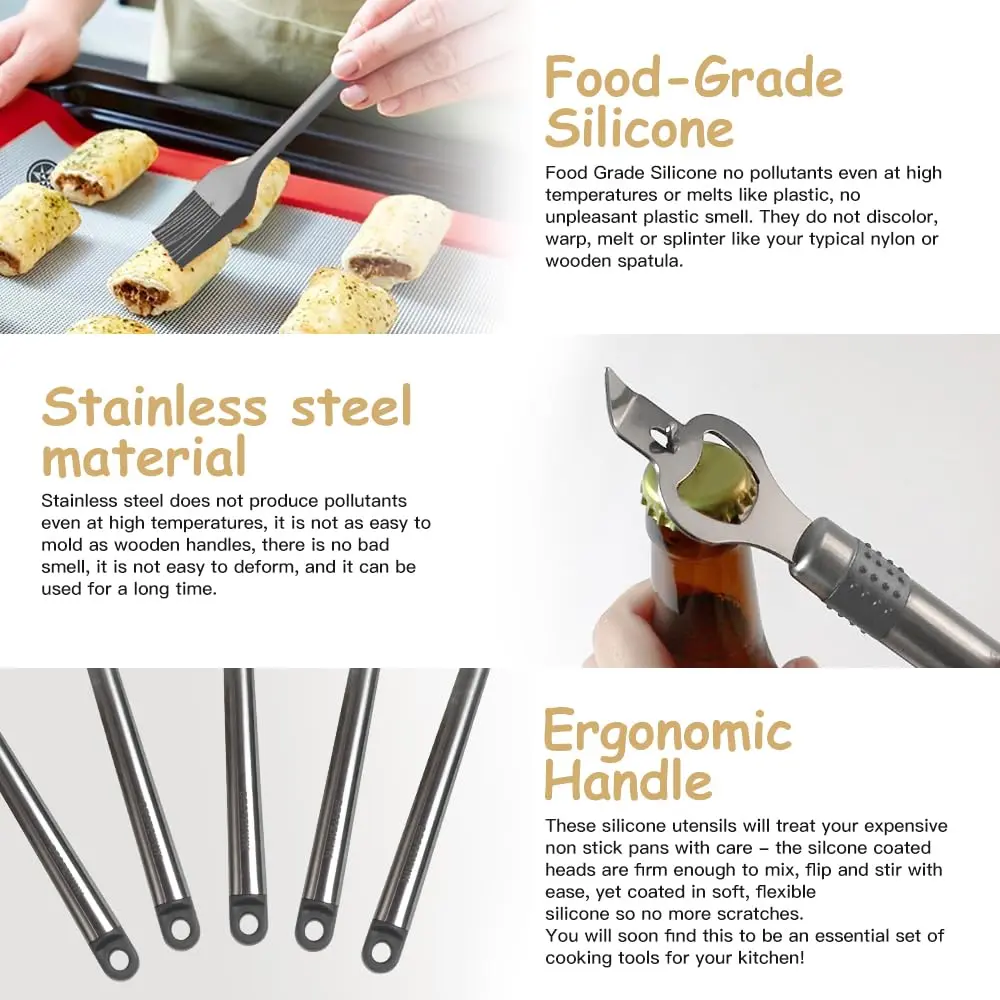 ·LASTS A LIFETIME: The most durable utensils set in the market features thick handles designed using top-grade 304 stainless steel, and utensil heads made out of durable silicone. Even with daily use, they’re designed to not bend like plastic utensils, not break like wooden kitchen tools, and not rust like other metallic utensils.