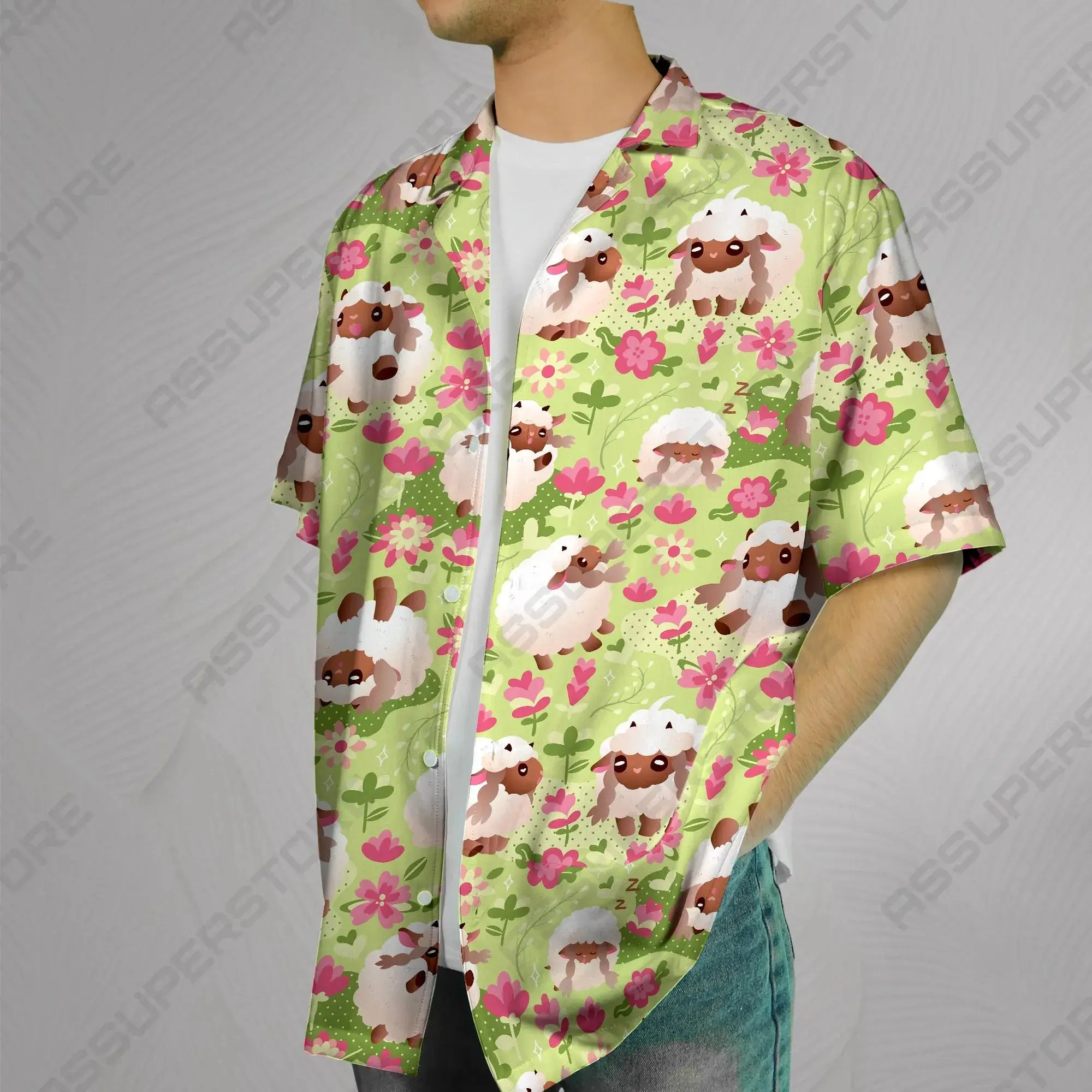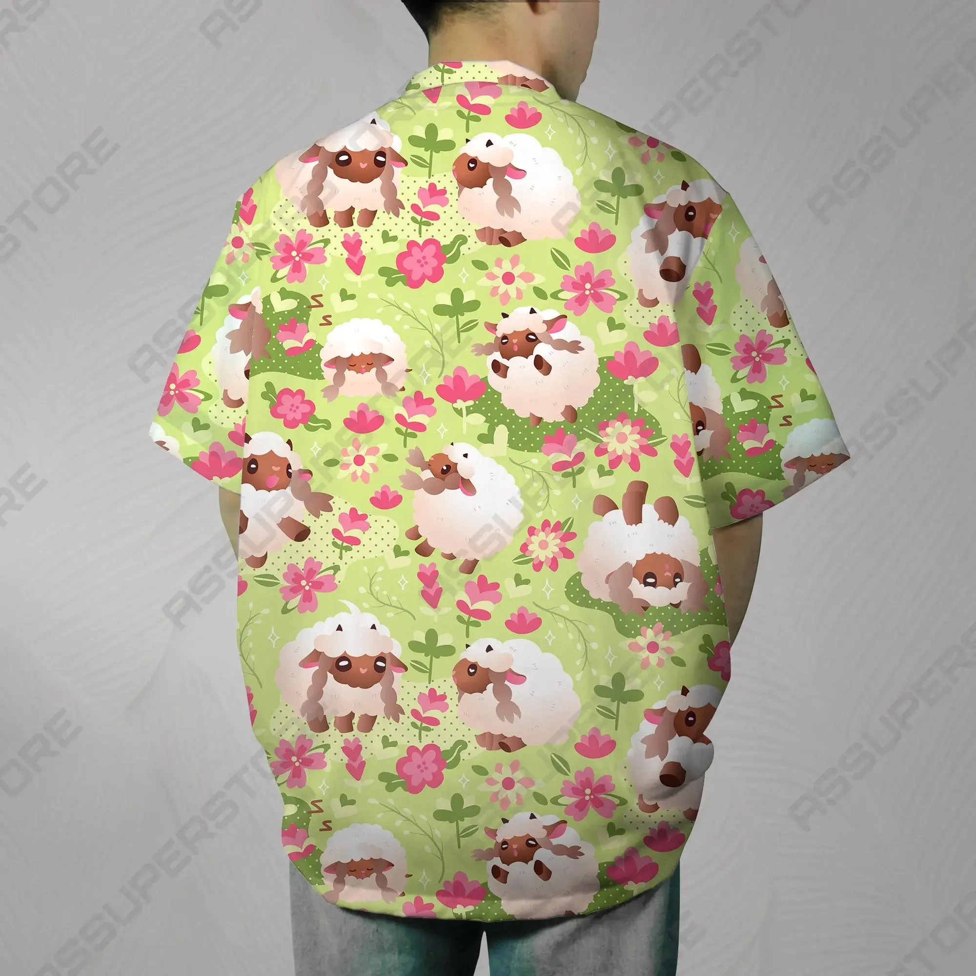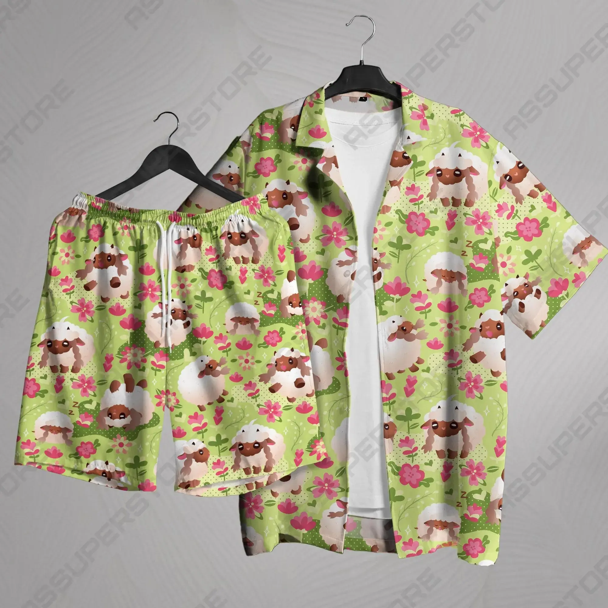 5. Cute Fluffy Sheep Floral Hawaiian Shirt Shorts Set Men Women Kawaii Sleeping Lamb Pink Blossom Green Print Loose Aloha Beach Outfit Summer Vacation Cottagecore Co-ord