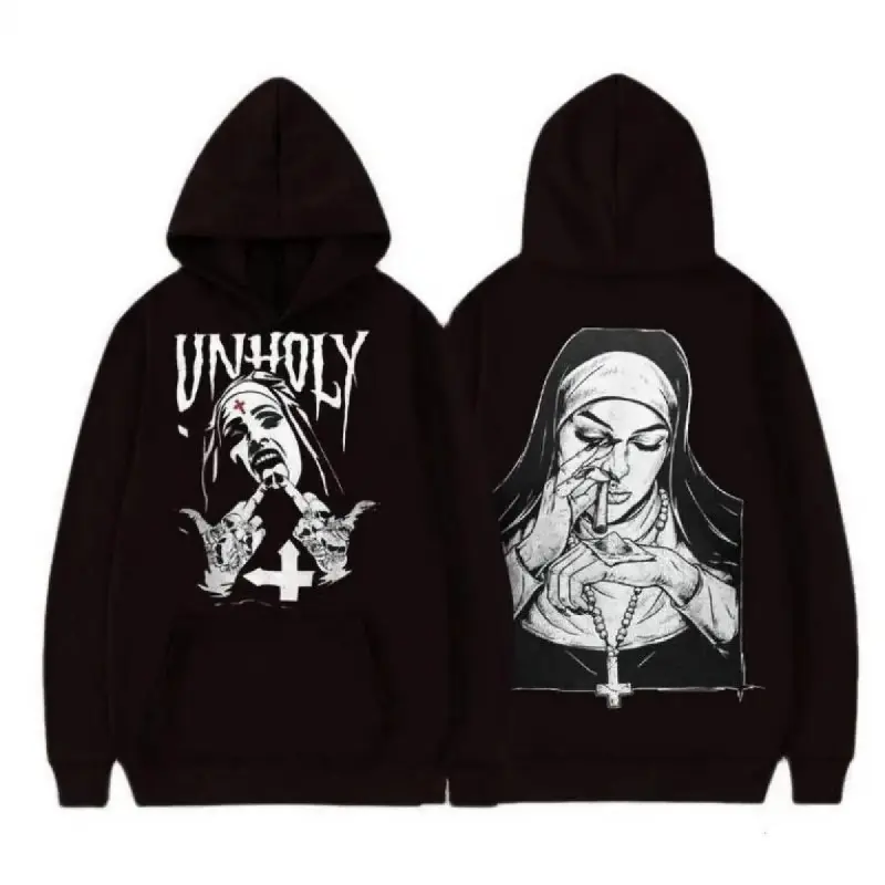 π·οΈEmbrace your dark and edgy style with this Unholy Nun Graphic Hoodieπ·οΈ!Featuring bold gothic artwork and a cozy hood design, this hoodie is perfect for alternative fashion lovers, streetwear enthusiasts, Halloween, concerts, or everyday casual wearπ