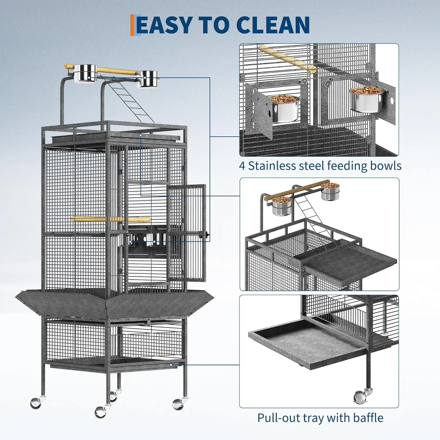 • Easy-Clean Design for Hassle-Free Maintenance: Removable tray and built-in seed guard make cleaning this large bird cage effortless. External-access feeders on this bird cages unit ensure hassle-free daily care without disturbing your birds