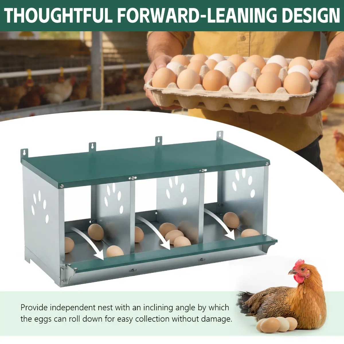 【Protect Your Eggs】Nesting box chassis has a slight tilt design which encourages your precious eggs to roll forward underneath the secure lid where they will remain intact until you are ready to collect.We recommend placing some padding under the lid of the egg collection box to further protect the eggs from collisions.