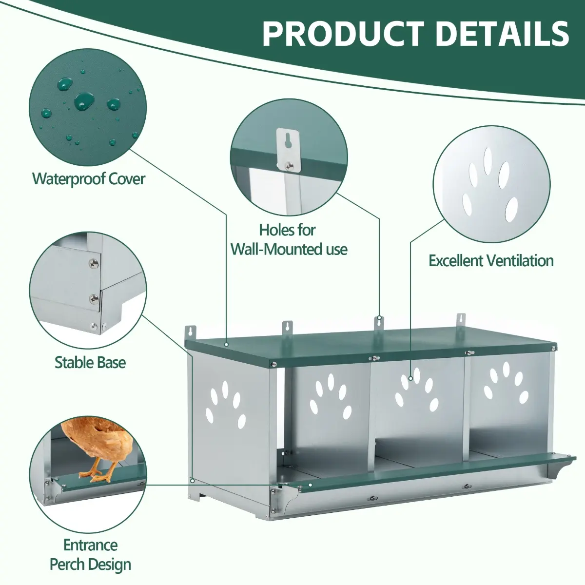 【Special Design】This metal chicken coop has a unique design that encourages hens to lay eggs in the coop area. The egg box is made of heavy-duty galvanized steel, which is safe, durable and non-foldable. It has ventilation holes on the side to increase ventilation, making the chickens feel relaxed, providing a good environment for the hens and increasing production.