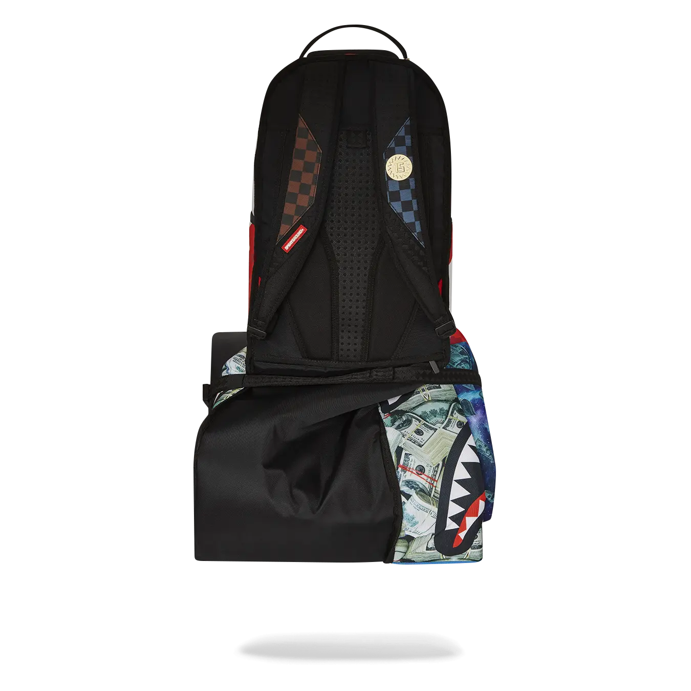 Dimensions: 18" x 6" x 11.5" • Front zipper pocket • Side pockets • Zippered Stash pocket • Separate velour sunglass compartment • Ergonomic mesh back padding • Adjustable Straps for custom sizing • Gold zippers with metal hardware • Metal "Sprayground Authentic" badge • Slide through back sleeve connects to carry-on luggage to free your hands