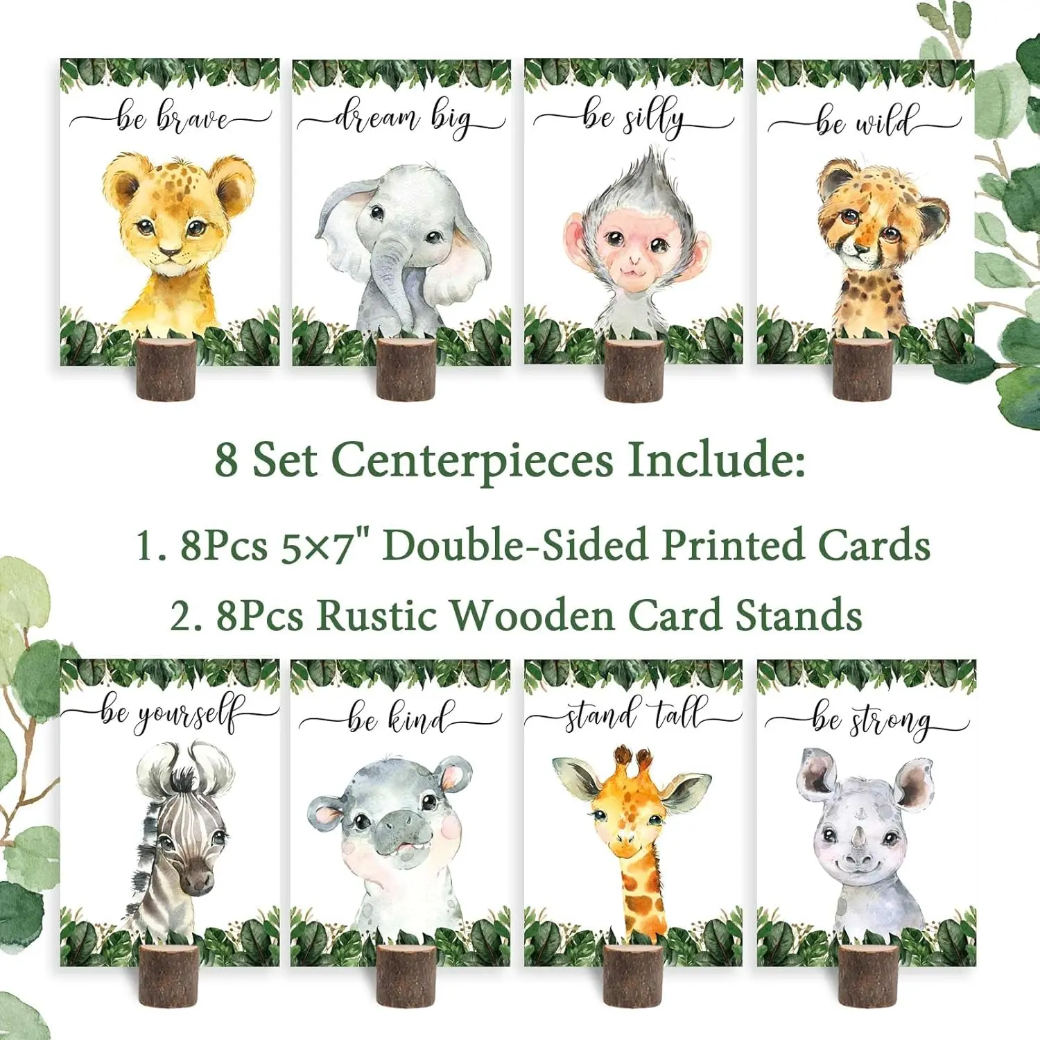 ·Safari Centerpieces Including: 8pcs different safari cards and 8pcs wooden stands. Perfect for safari jungle baby shower, baby sprinkle, baptisms, first birthday, kids party, boy’s or girl’s birth and more!
