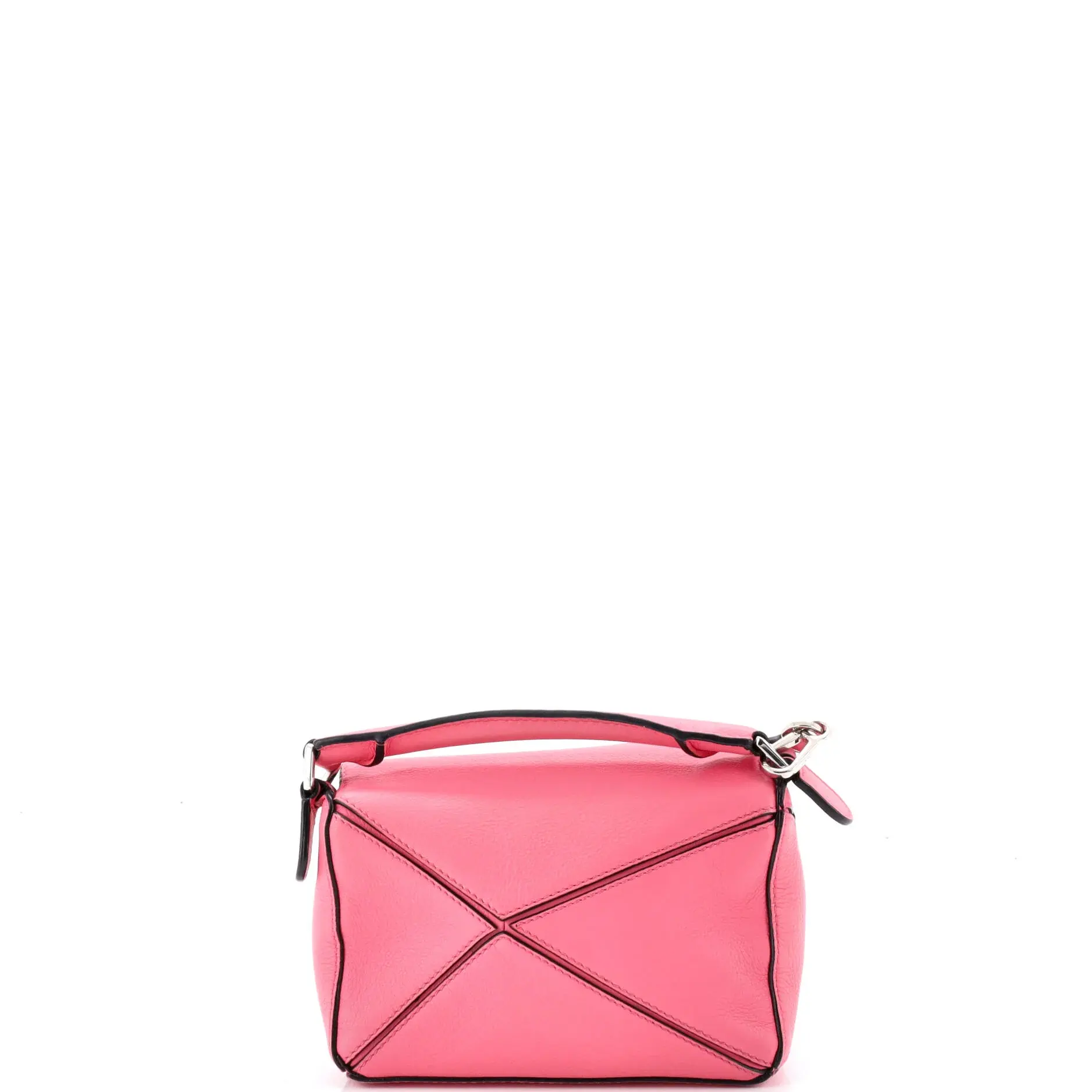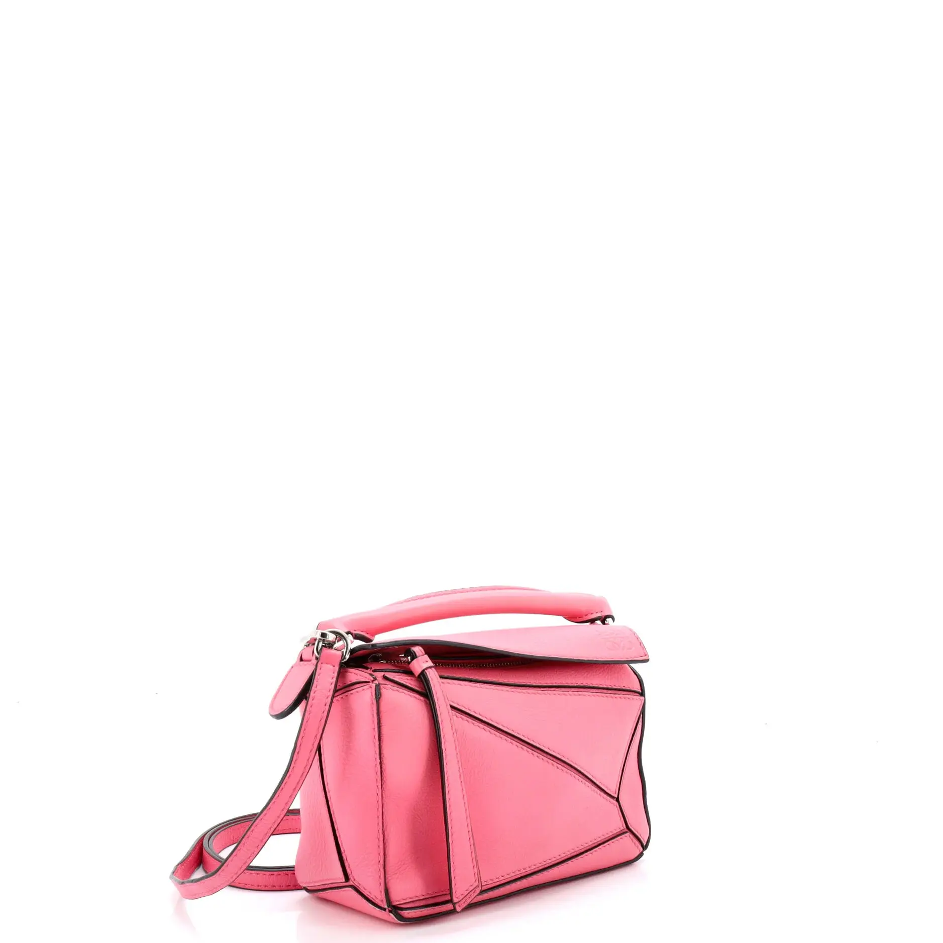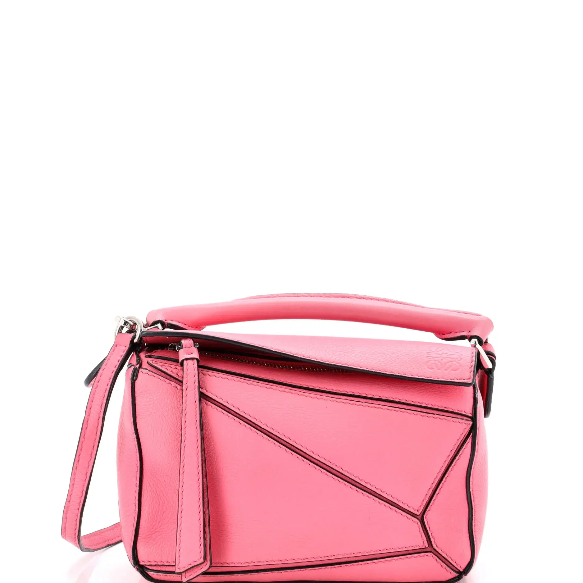 These are professional pictures of the actual item offered by Rebag. Estimated Retail Price: $2,100 Condition: Good. Exterior: heavy corner wear, edge wear, creases, minor scuffs | Handles/Straps: creases, minor scuffs, minor cracking | Interior: discoloration, scuffs, light odor | Hardware: scratches Accessories: With Strap Measurements: Handle Drop 1.5", Height 5", Width 7", Depth 3.5", Strap Drop 21.5" Designer: Loewe Model: Puzzle Bag Leather Mini Exterior Material: Leather, Leather Exterior Color: Pink Interior Material: Fabric Interior Color: Neutral Hardware Color: Silver Item Number: 414751/1