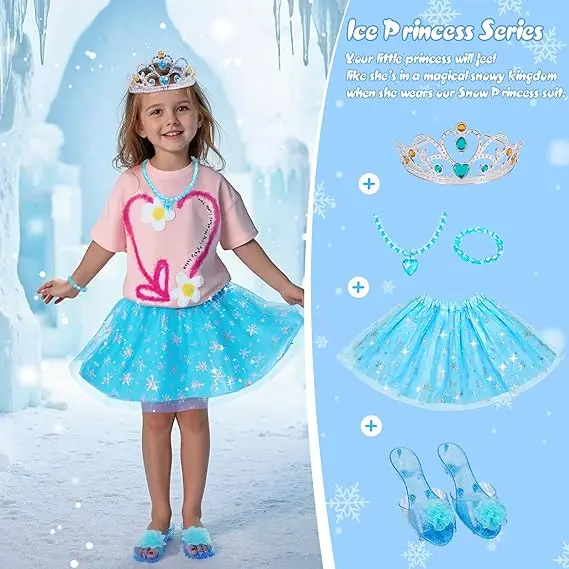 ·Complete Princess Skirt & Heels Set for Dress Up Fun – Includes layered princess skirts with stretchy elastic waistbands for a comfortable fit, made with soft materials and sparkling star details for a dazzling look. The toddler-sized princess heels feature non-slip silicone soles to help protect floors while little princesses enjoy hours of fun dress-up play.