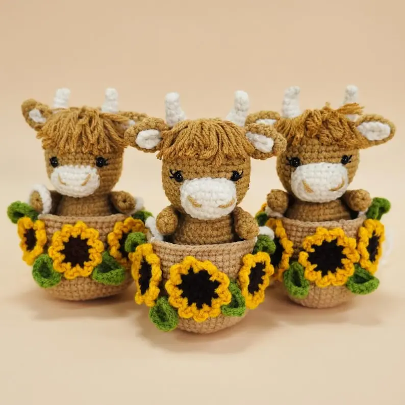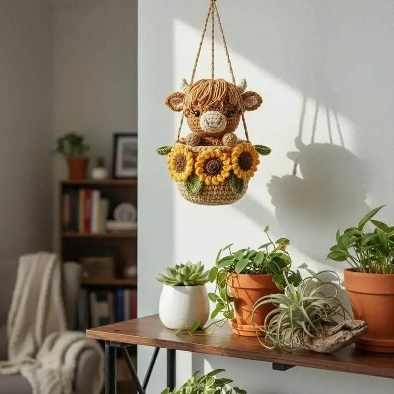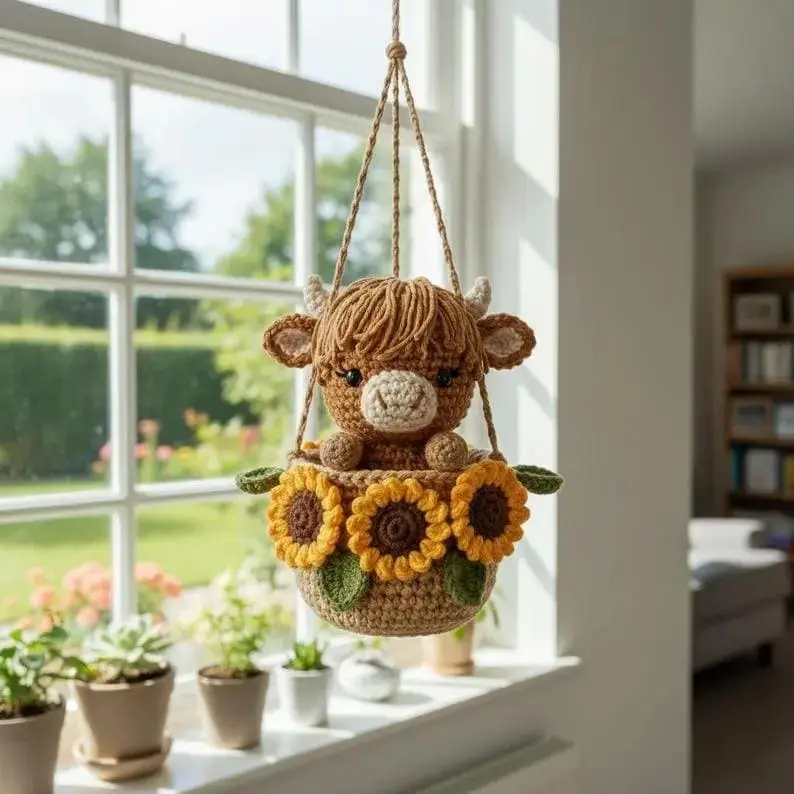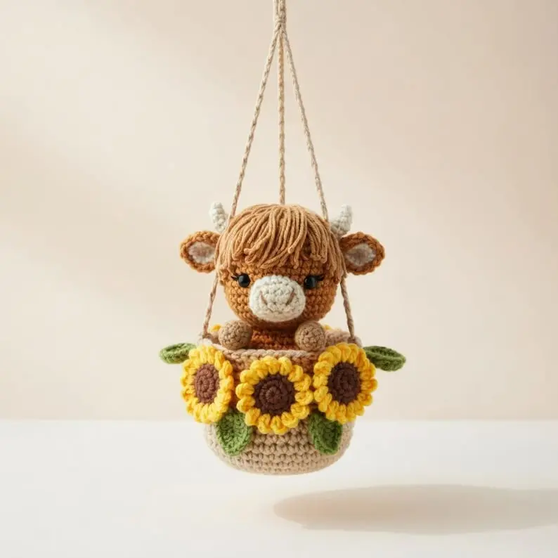 Bring a cozy farmhouse touch to your space with this adorable Handmade Crochet Sunflower Highland Cow in Plant Pot Hanging Decor. This charming piece features a sweet baby highland cow nestled in a cute plant pot with sunflower details, making it a unique handmade decoration for your car, room, office, or gift collection.