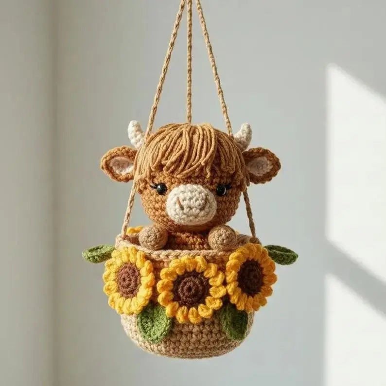 Carefully crocheted with attention to detail, this highland cow hanging decor is perfect for adding warmth and personality to your rearview mirror, wall hook, shelf, or cozy corner at home. The combination of the cute cow design, rustic plant pot, and cheerful sunflower creates a lovely handmade accent that feels both playful and heartwarming.