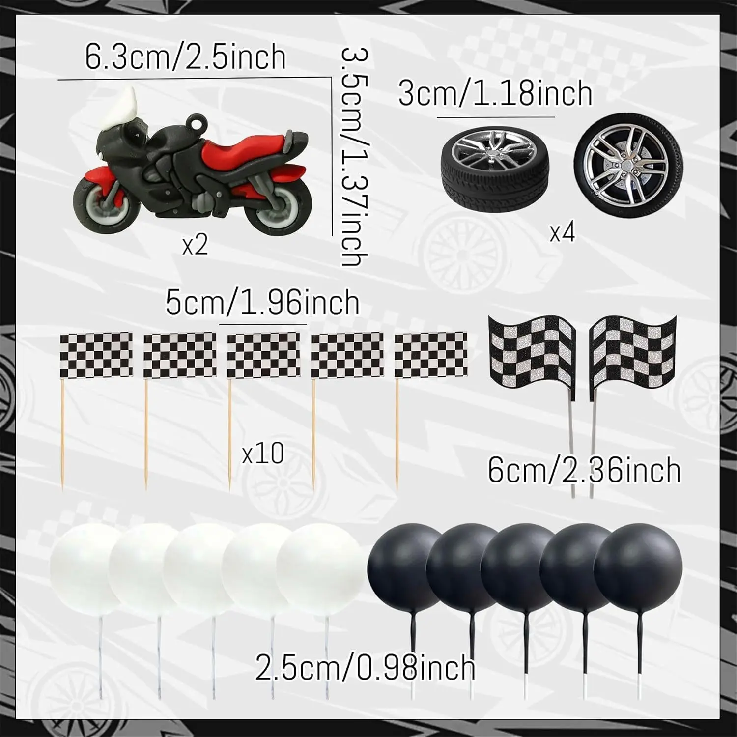 【Comprehensive Set】: This 28-piece set includes racing flags, foam ball picks, and 3D motorcycle ornaments for cake decoration.