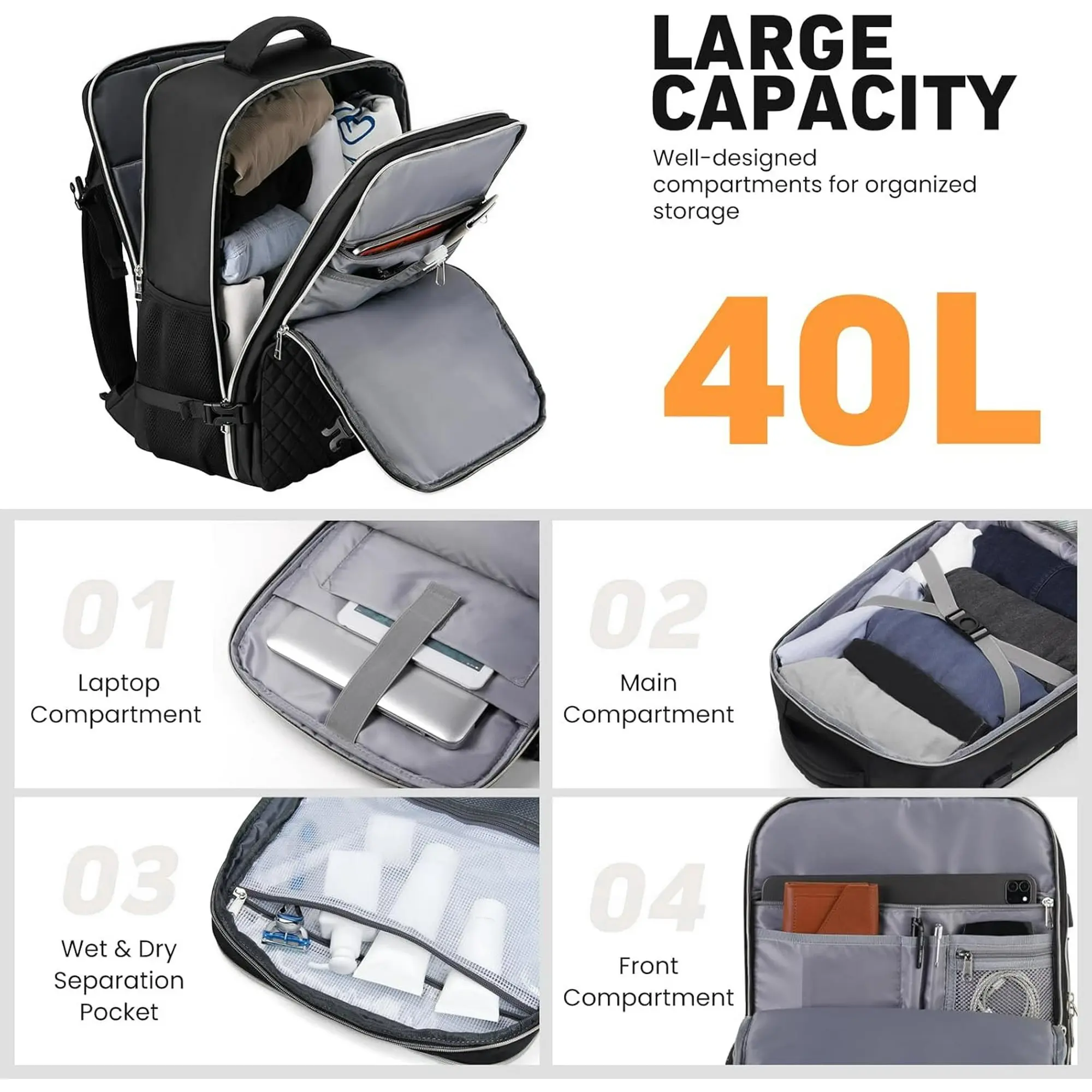 Our backpack has a 40L Large capacity and features a spacious capacity with a reasonable partition, including a padded notebook/tablet compartment for 17" laptop and 12.9'' iPad; a main compartment storing a lot of things including 5-8 pieces of clothing, shoes, books, and many other items; a front compartment with many pockets to keep your belongings organized.