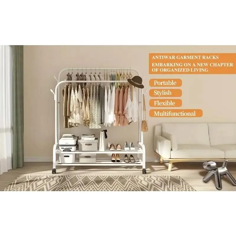 The dual hanging bars allow you to sort clothes by type or season, while the bottom shelf offers convenient space for shoes, storage bins, or folded items. With built-in side hooks, you’ll have extra room for hanging accessories like bags, hats, or scarves.