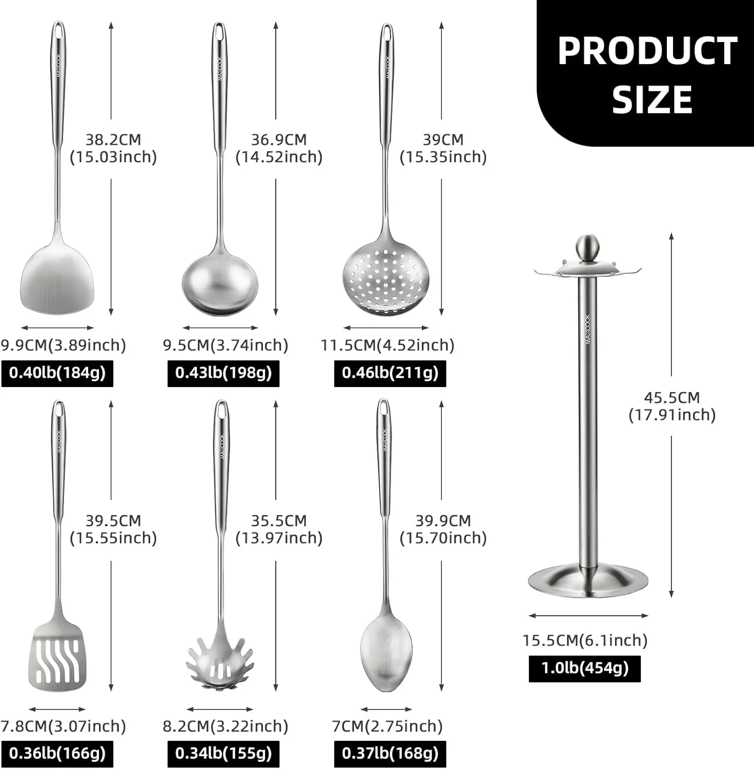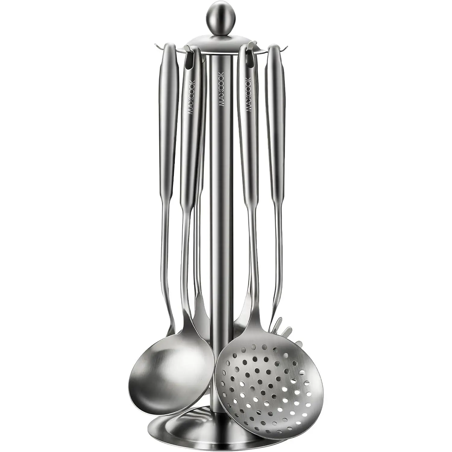 ·【Stainless Steel Utensil Set of 7】This 7-piece professional cooking tools set includes: 1 x Solid Turner, 1 x Slotted Spatula Turner, 1 x Skimmer, 1 x Soup Ladle, 1 x Spaghetti Server, 1 x Solid Spoon, 1 x Rotating Holder.The 7-piece spatula and spoon set can be matched to meet your different needs when cooking. You can also hang all the spoons on the rotating holder for easy access, saving you space in the kitchen and keeping everything organized