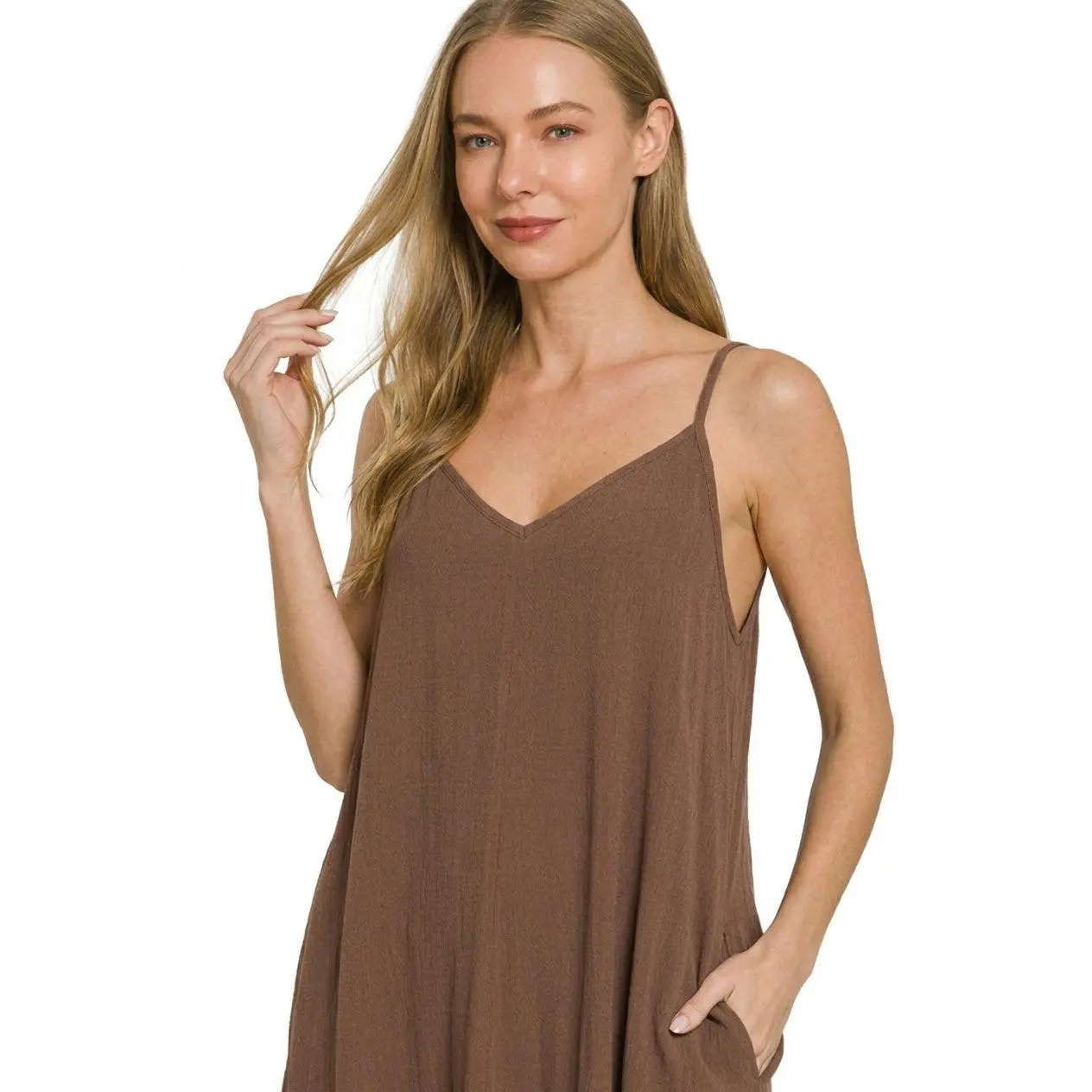 The Woven Crinkle Cami Maxi Dress with Side Pockets is a stylish and practical choice for any occasion. The woven crinkle fabric adds a textured and airy look to this maxi dress. The cami-style top is perfect for warm weather, while the maxi length offers a flowy and elegant silhouette. The side pockets add functionality and convenience to this chic dress. Whether worn with sandals for a casual day out or dressed up with heels for a special event, this dress is sure to make a statement with its combination of style and comfort.