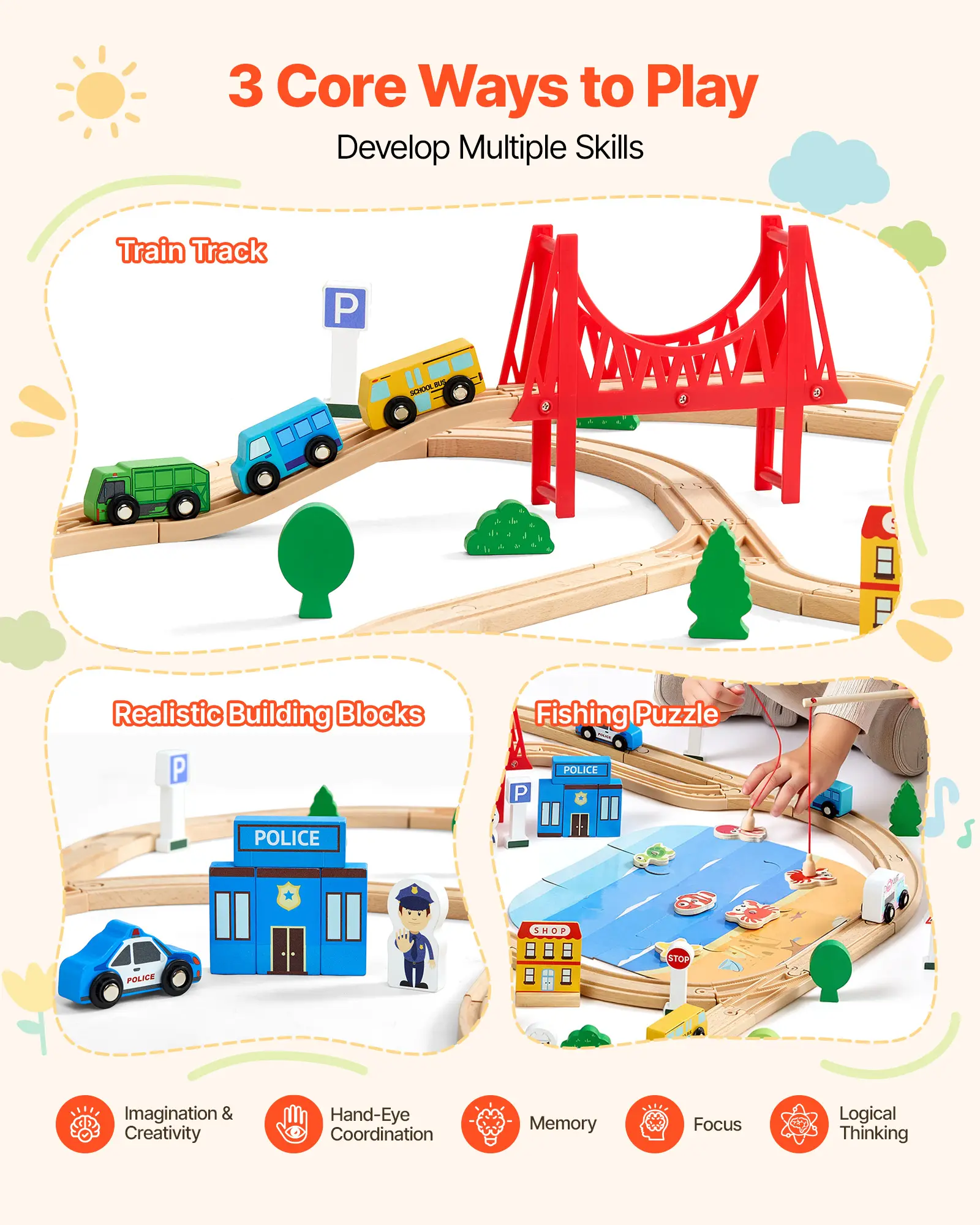 Immersive Play Scenes: This wooden train set features traffic tracks, city buildings (hospital, police station, farm), and fishing scenes, supporting train track play, role-playing, and fishing games. Boosts imagination, hand-eye coordination, and more
