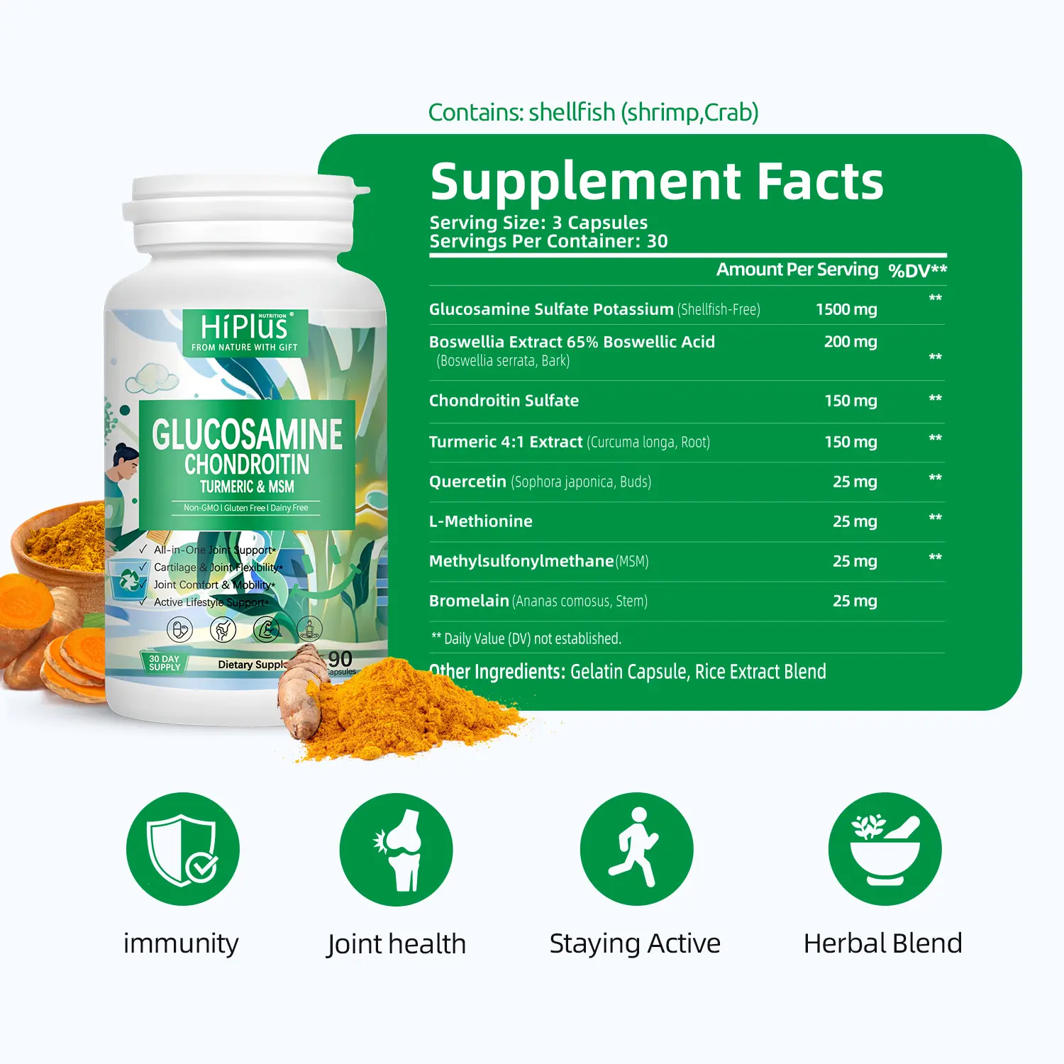Bromelain,Methylsulfonylmethane,L-Methionine,Quercetin,Turmeric 4:1 Extract,Chondroitin Sulfate,Boswellia Extract,Glucosamine Sulfate Potassium (Shellfish-Free)