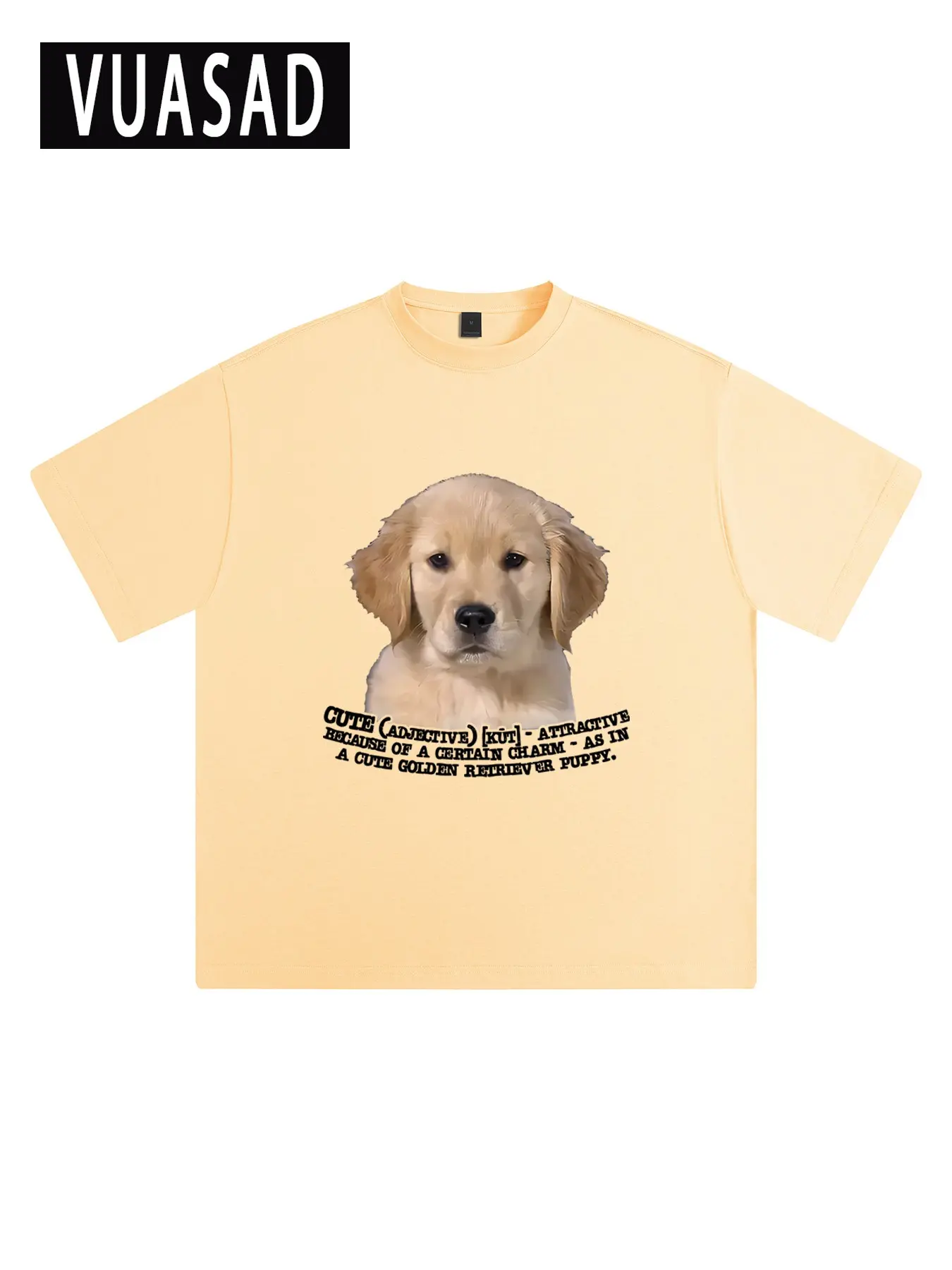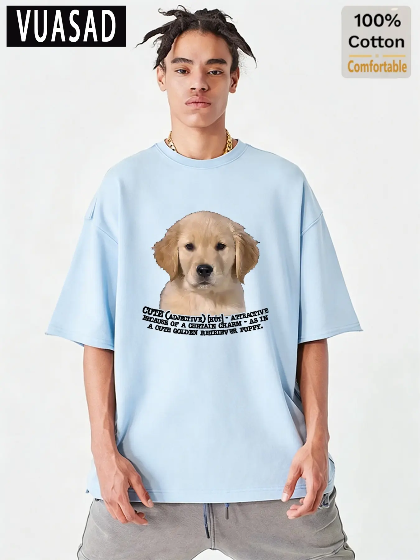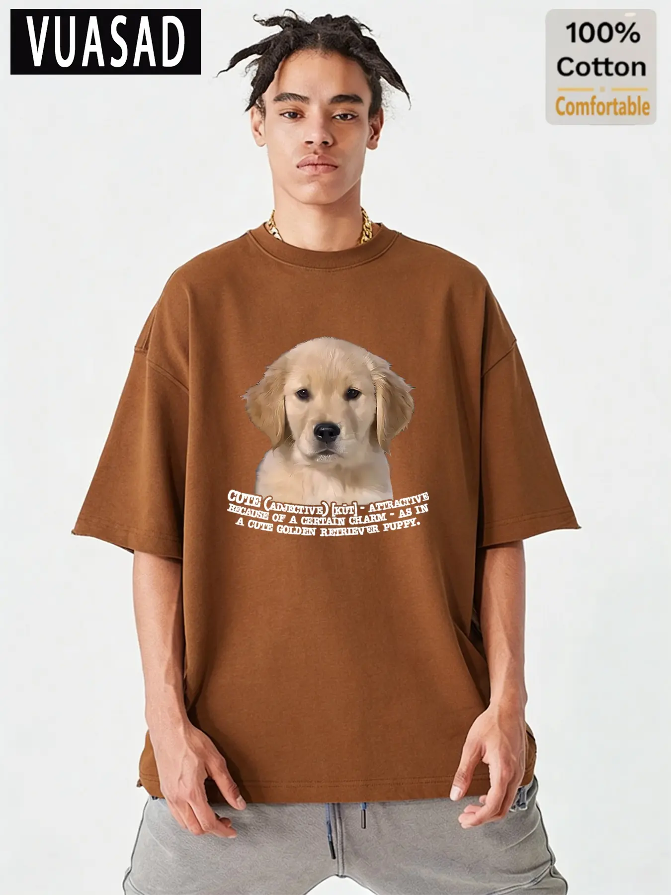 Adorable Golden Retriever Puppy Print Short Sleeve T-Shirt, Men's Loose-Fit Drop Shoulder Cotton Top, Casual Fashion Long Tee