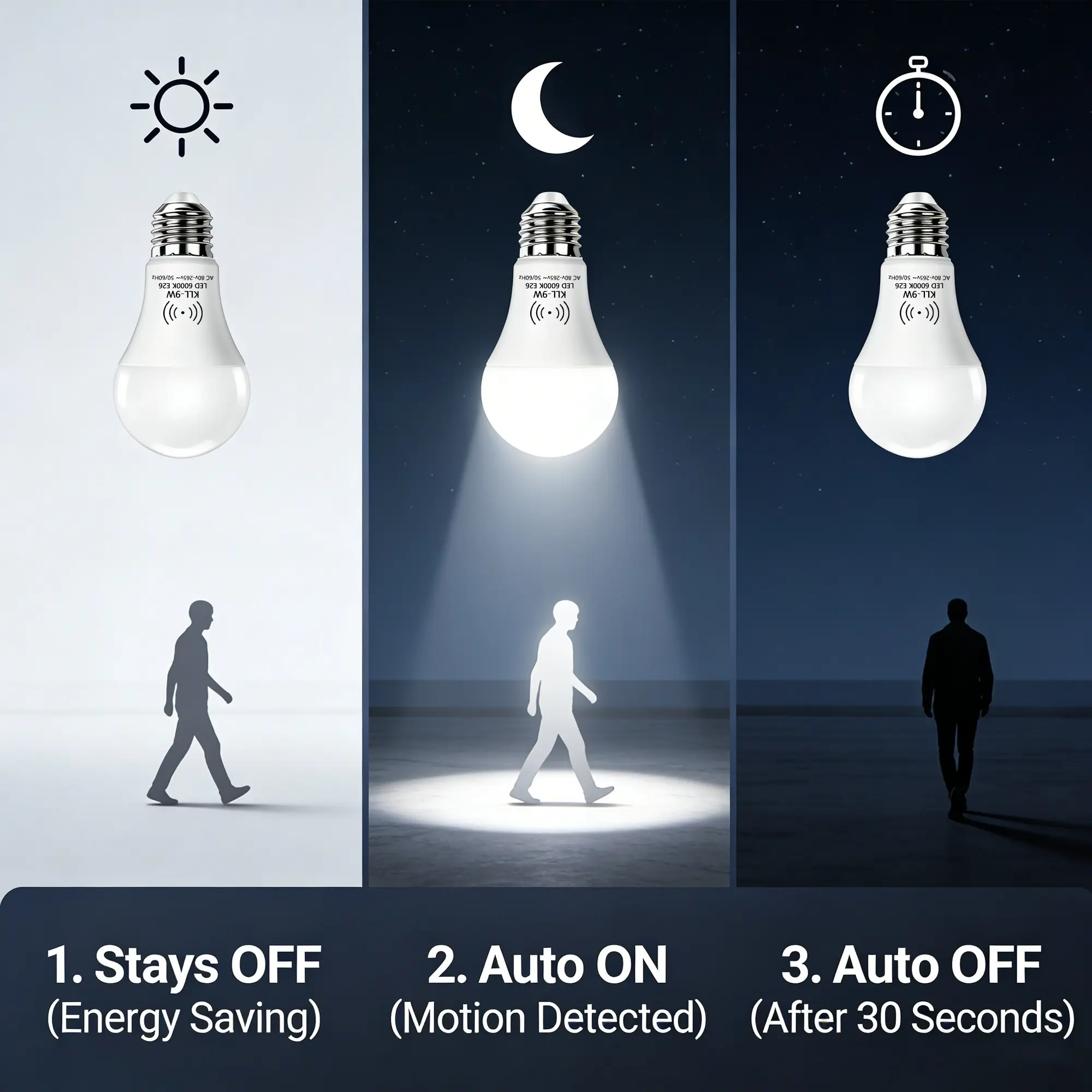 Warm Tips – Please Read Before Purchase: Light did not come on? Please note that this motion sensor bulb only turns on when it detects movement in darkness—it won’t activate during the day, also, please keep the switch always “ON”。 Motion sensor doesn‘t work unless 1 foot away? To ensure proper function, the sensor must face downward and must not be blocked by fixture covers or enclosures. Check Compatibility: Not all fixtures support sensor bulbs. If your fixture is enclosed, upside-down, or has frosted covers, this bulb may not work.