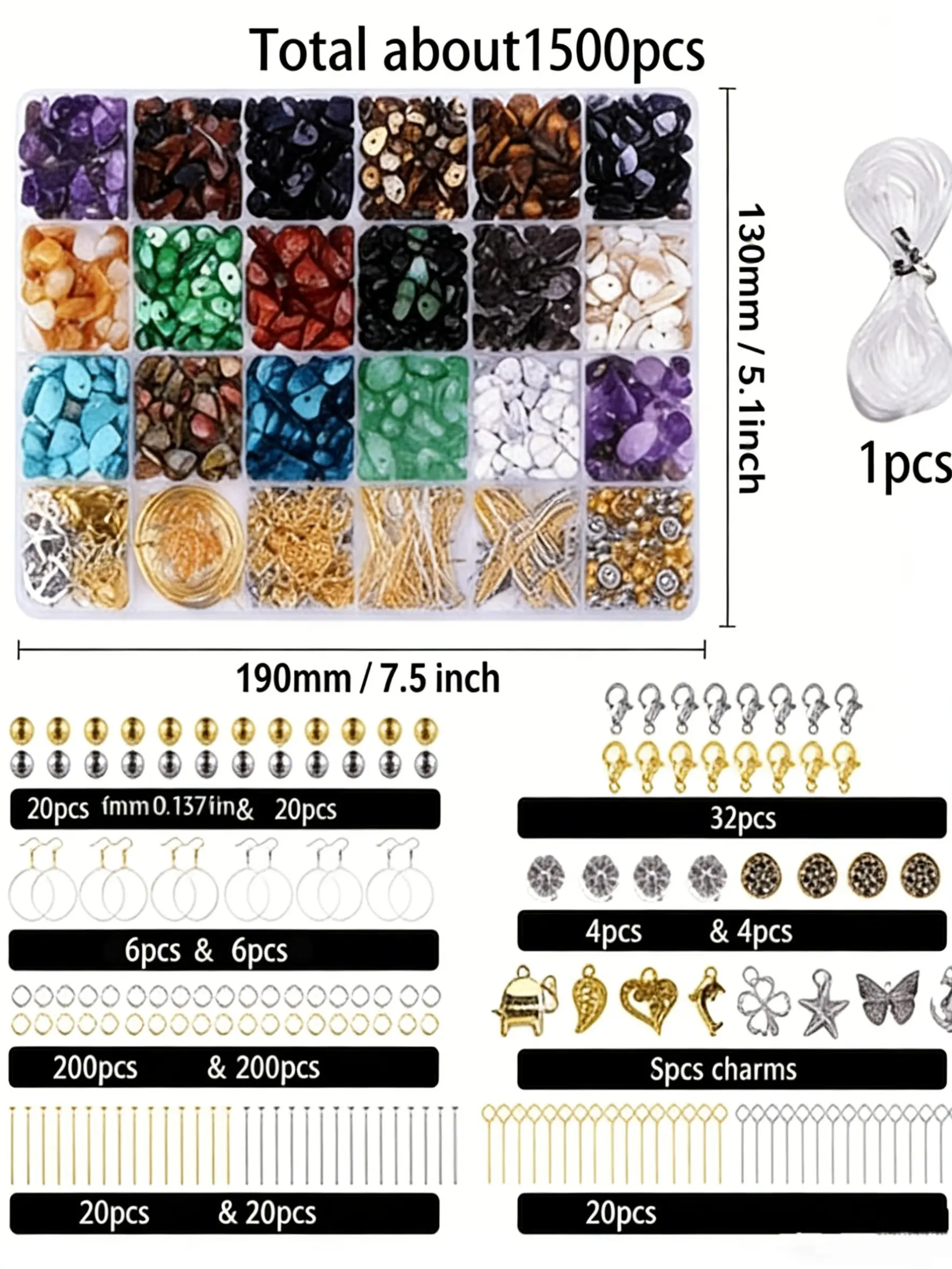 【Comprehensive Kit】: Includes 1500 lucky gemstone beads, glass beads, strand charms, storage box, and elastic cord.