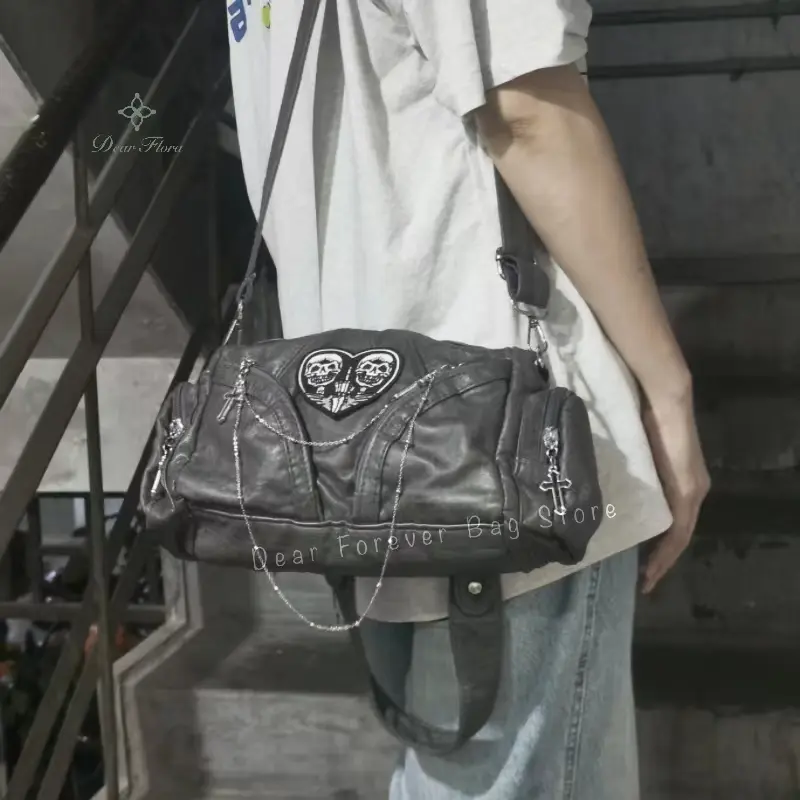 Elevate your style with this Y2K Vintage Motorcycle Shoulder Bag. Crafted from soft PU, it features chains and multiple pockets. Perfect for moto enthusiasts, it doubles as a crossbody or handbag. Dimensions: W30cm x T11cm x H16cm. Handle height: 23cm. Adjustable shoulder strap: 105cm. Ideal for those who love a blend of fashion and functionality.