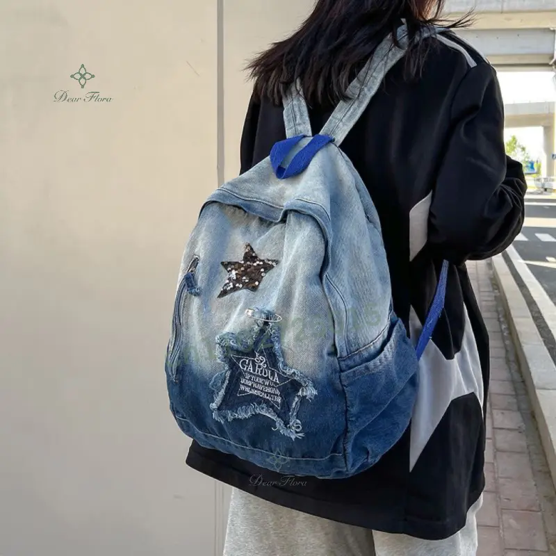Y2K Korean Casual Denim Backpack Fashion Star Pattern Large Capacity Student Schoolbag Teenagers Vintage Punk Travel Book Bag