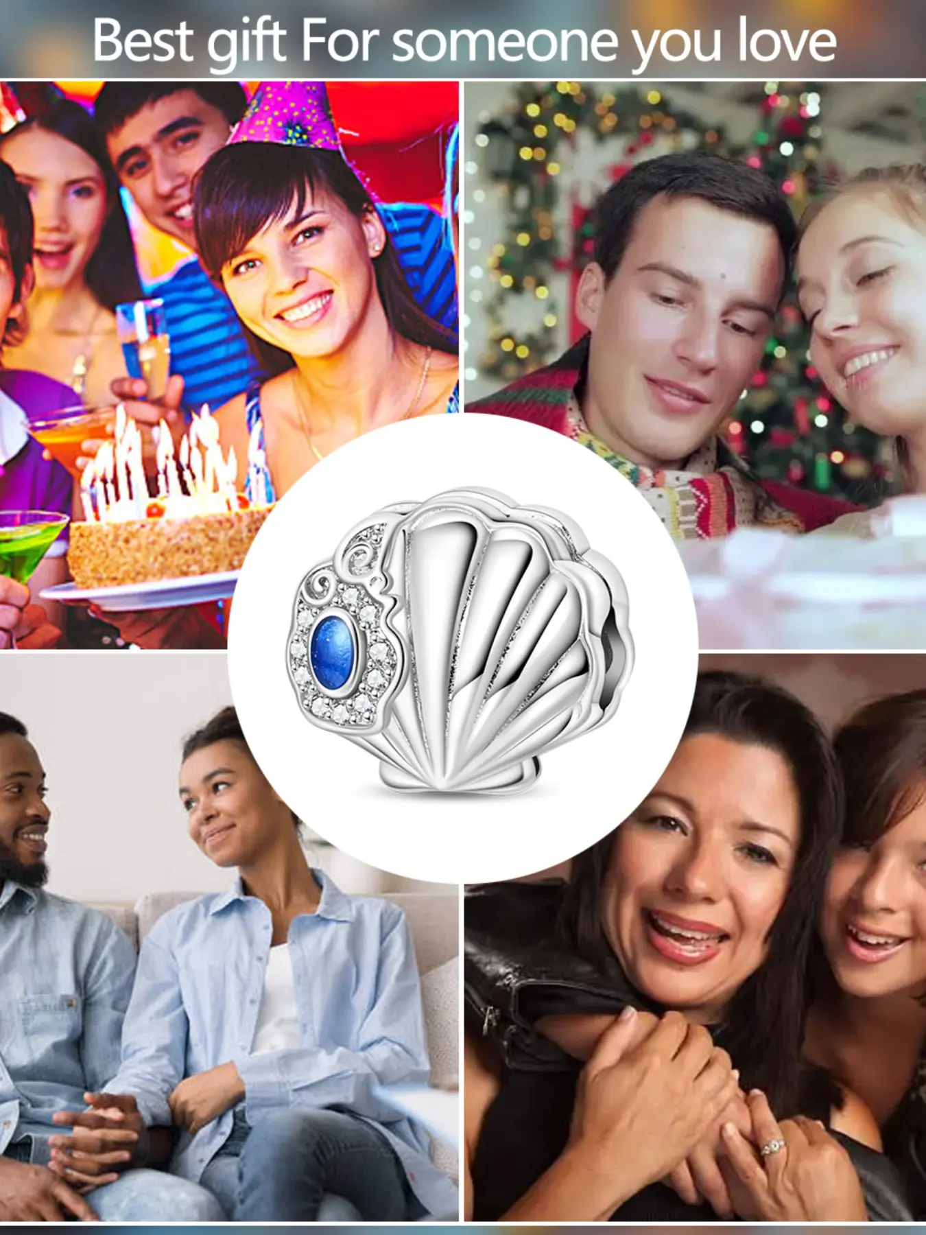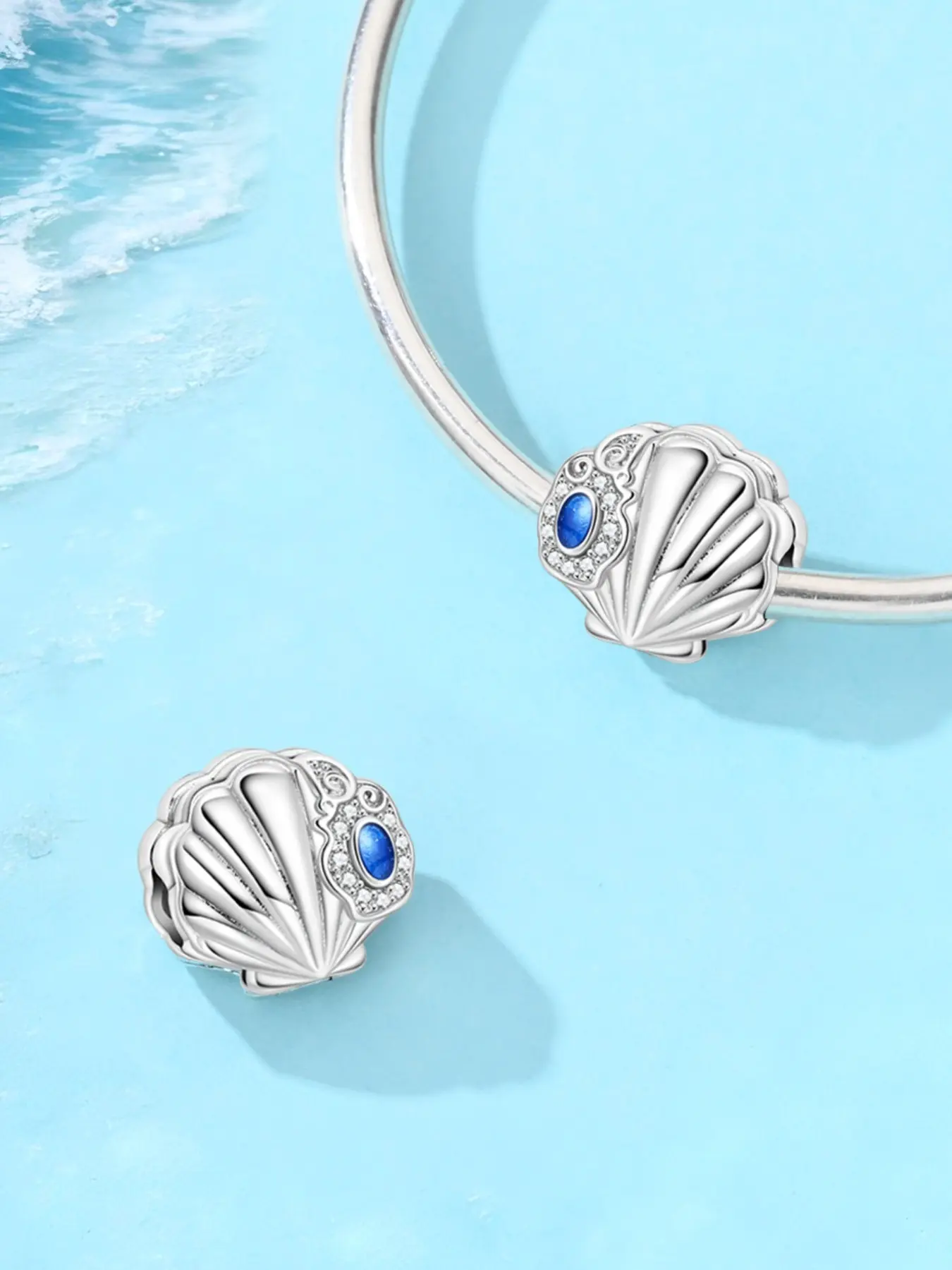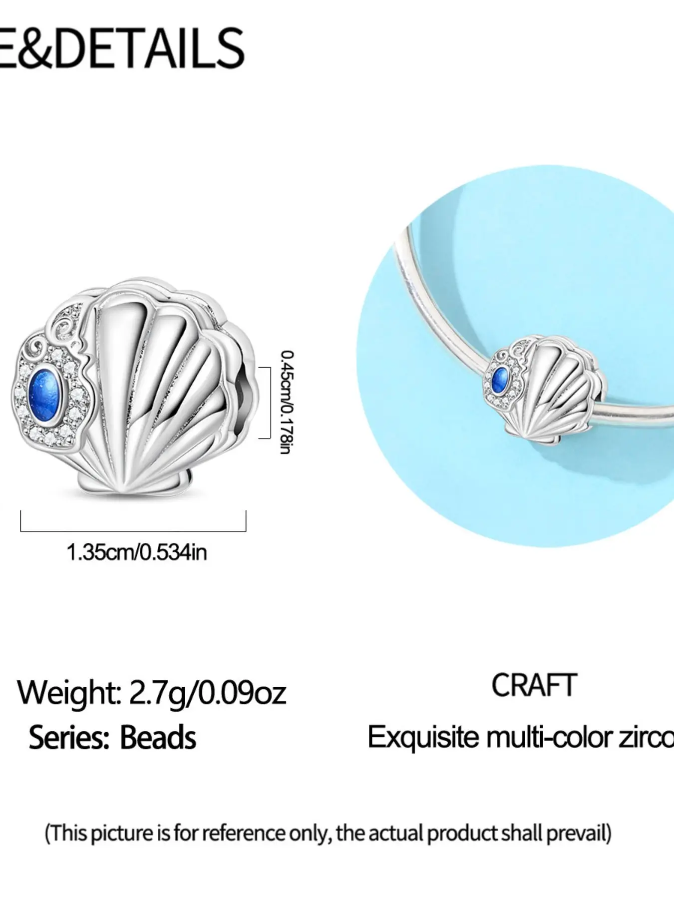 Summer Vacation Seashell Bead Charm, Plated 925 Silver Color, Blue Cz Inlaid, Ocean Themed DIY Jewelry, Beach Holiday Accessory for Women
