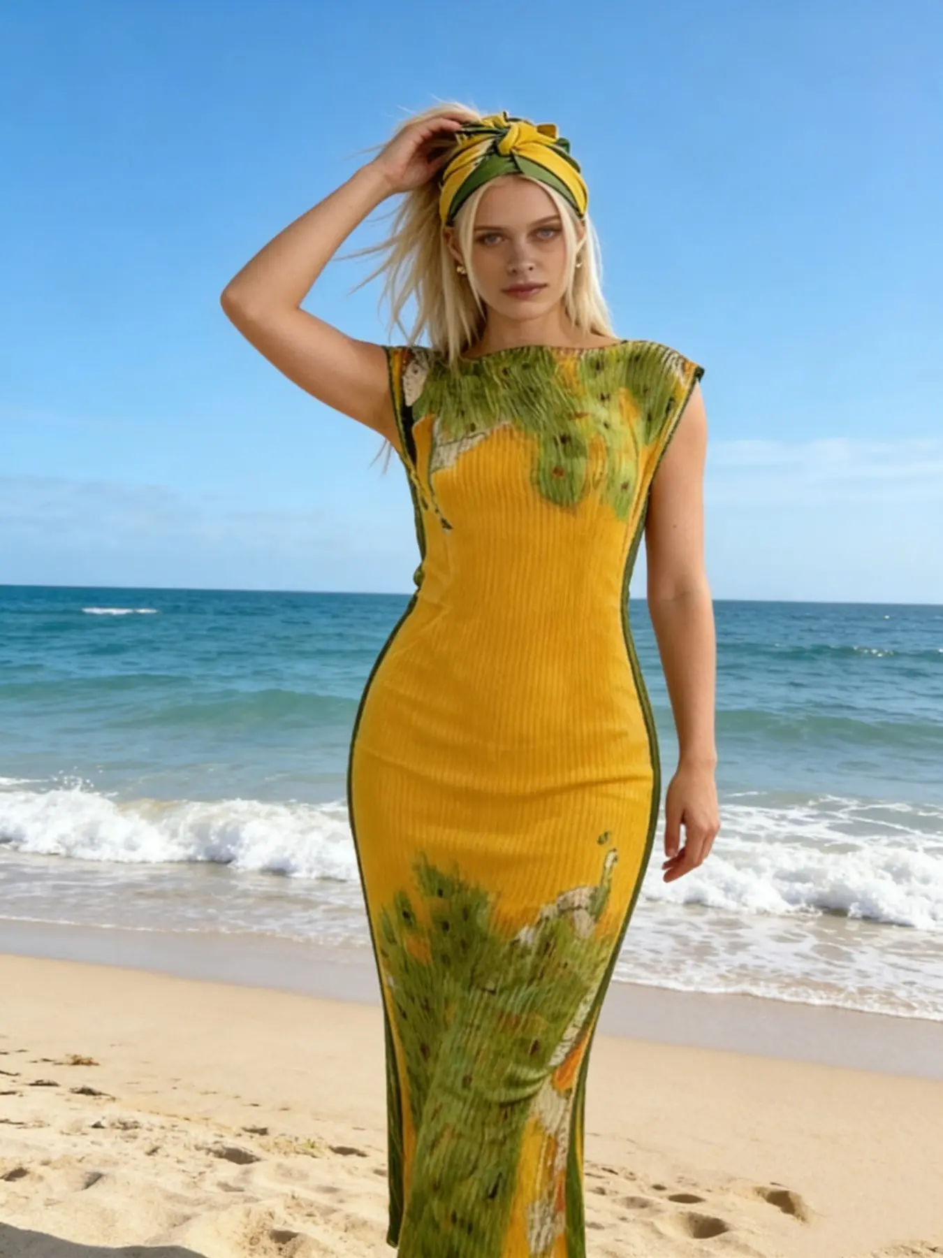 1dress+1headscarf Viral Lemon Yellow Green Leaf Print Pleated Bodycon Maxi Dress with Matching Headscarf – High Stretch, Sleeveless Luxury Set, Plus Size Friendly, Head-to-Toe Glam for Beach, Party & Resort, Must-Have Statement Fashion Piece
