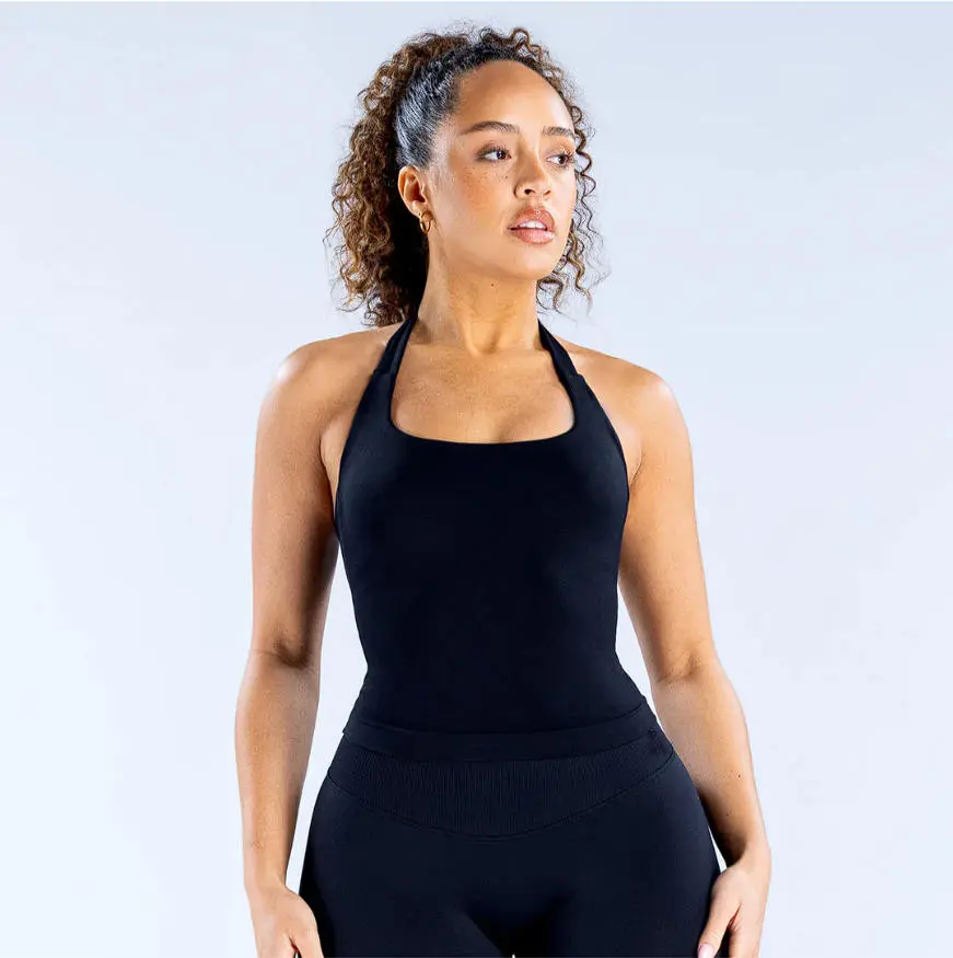 (With Logo)DFYNE 2 Piece Seamless Workout Outfit for Women - Halter Neck Sports Tank Top for Running Training Quick-Dry Compression Fitness Set