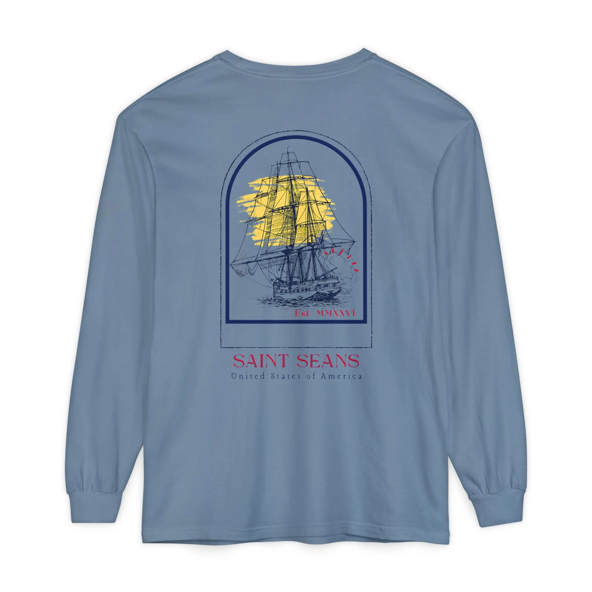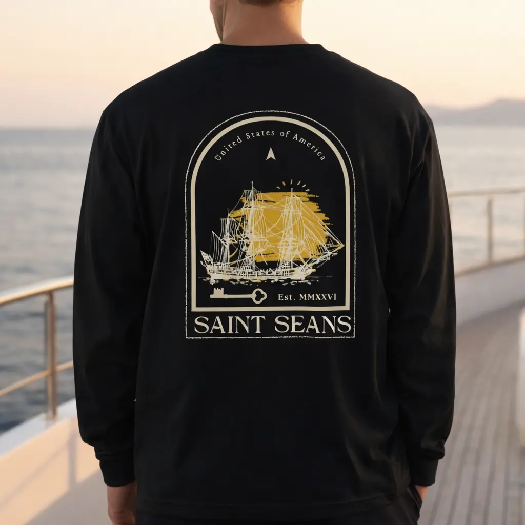 This long-sleeve shirt brings a refined, maritime mood to everyday wear. The soft, garment-dyed cotton and classic fit feel lived-in from the first wear, while the Saint Seans nautical crest adds an understated yacht-club elegance. Sleeves with ribbed-knit cuffs and double-stitched hems stand up to regular use without losing shape. Wear it layered over a light tee for foggy harbor mornings, or alone on an evening deck with sea-salted air. It fits the person who values quiet polish—someone who notices the cut of a collar, the texture of fabric, and prefers clothes that tell a quiet story of coastal weekends and slow, intentional travel. Bring this into a wardrobe for coastal retreats, club nights at the marina, or for evenings when you want to nod toward heritage style without shouting for attention.