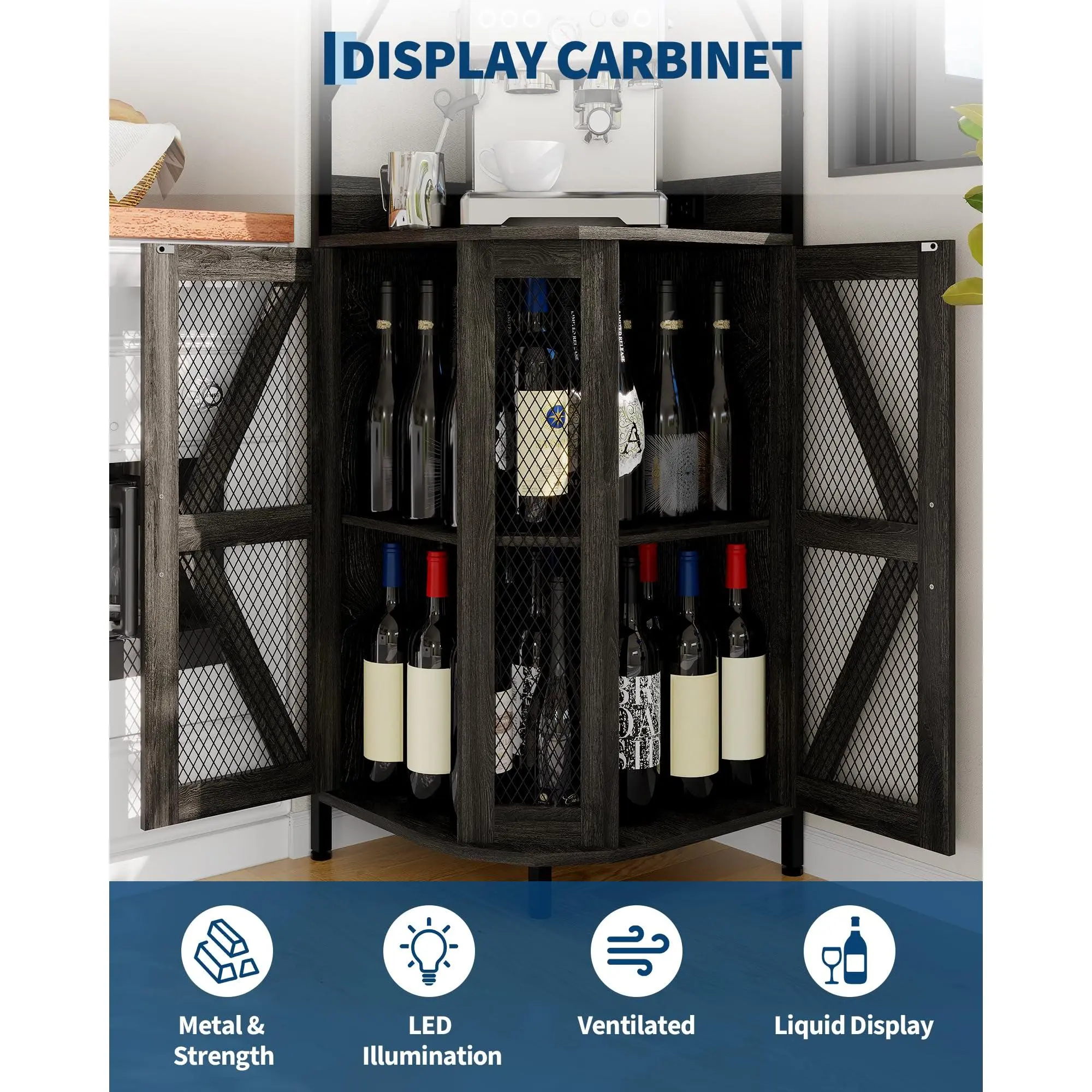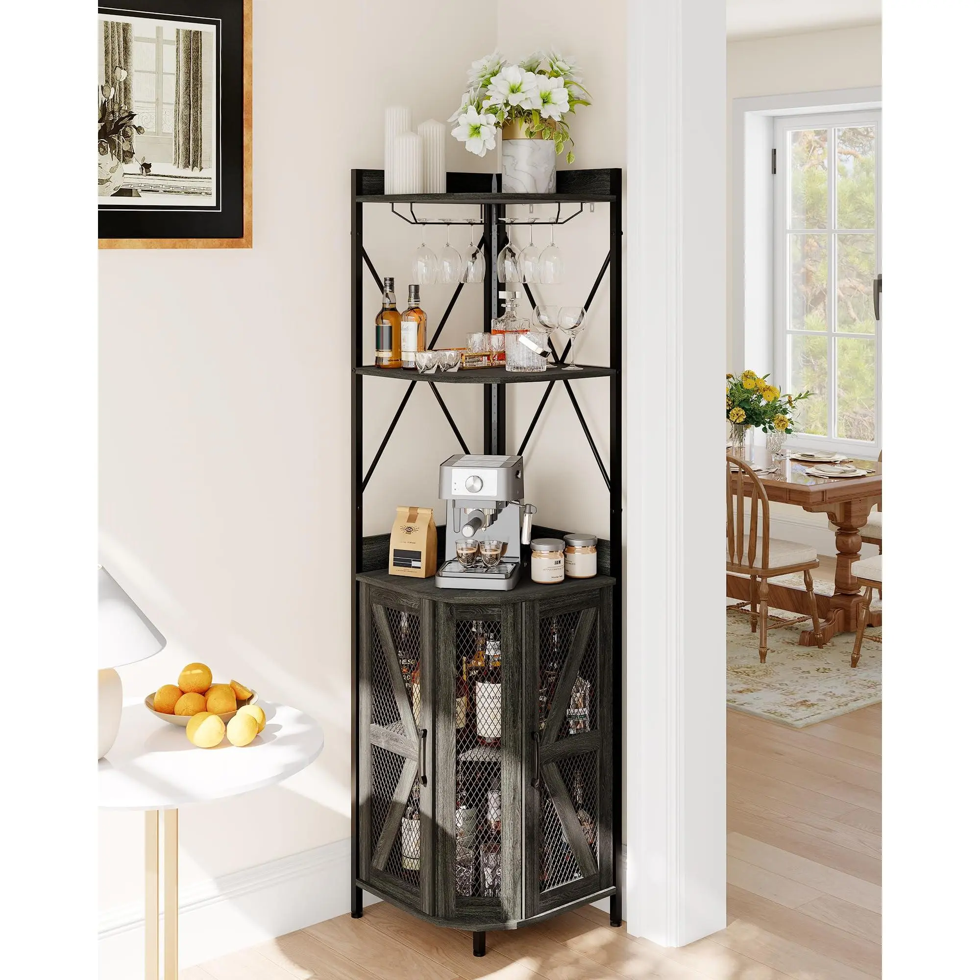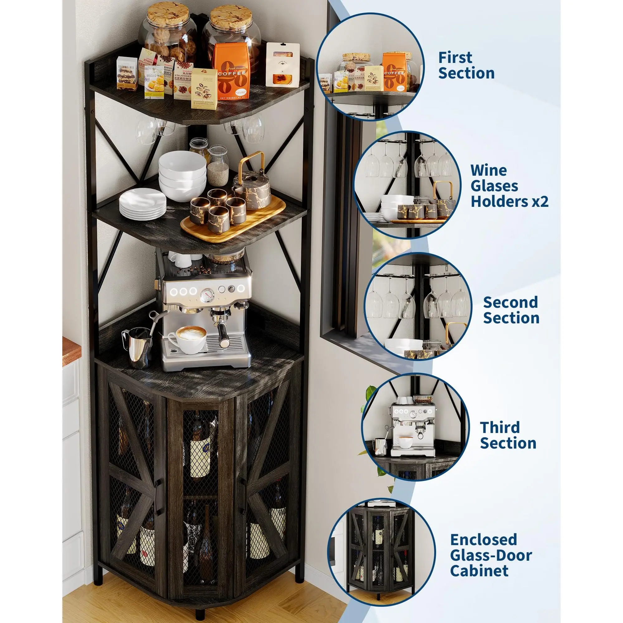 · 🍾Versatile Corner Design🍾🍾With a vertical corner structure and industrial-style design, this multifunctional corner bar cabinet maximizes unused corner space and blends seamlessly with most home décor styles. Perfect for kitchens, living rooms, dining areas, or entertainment spaces, it functions as a wine cabinet, coffee bar, or display storage unit.