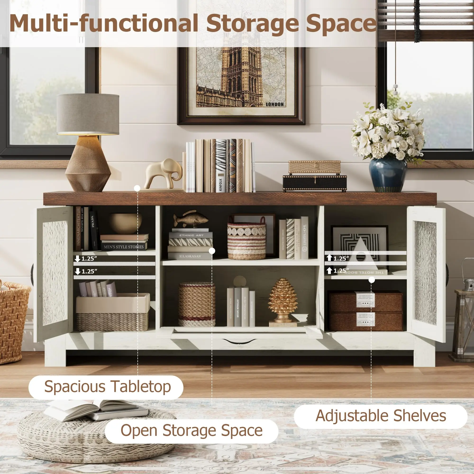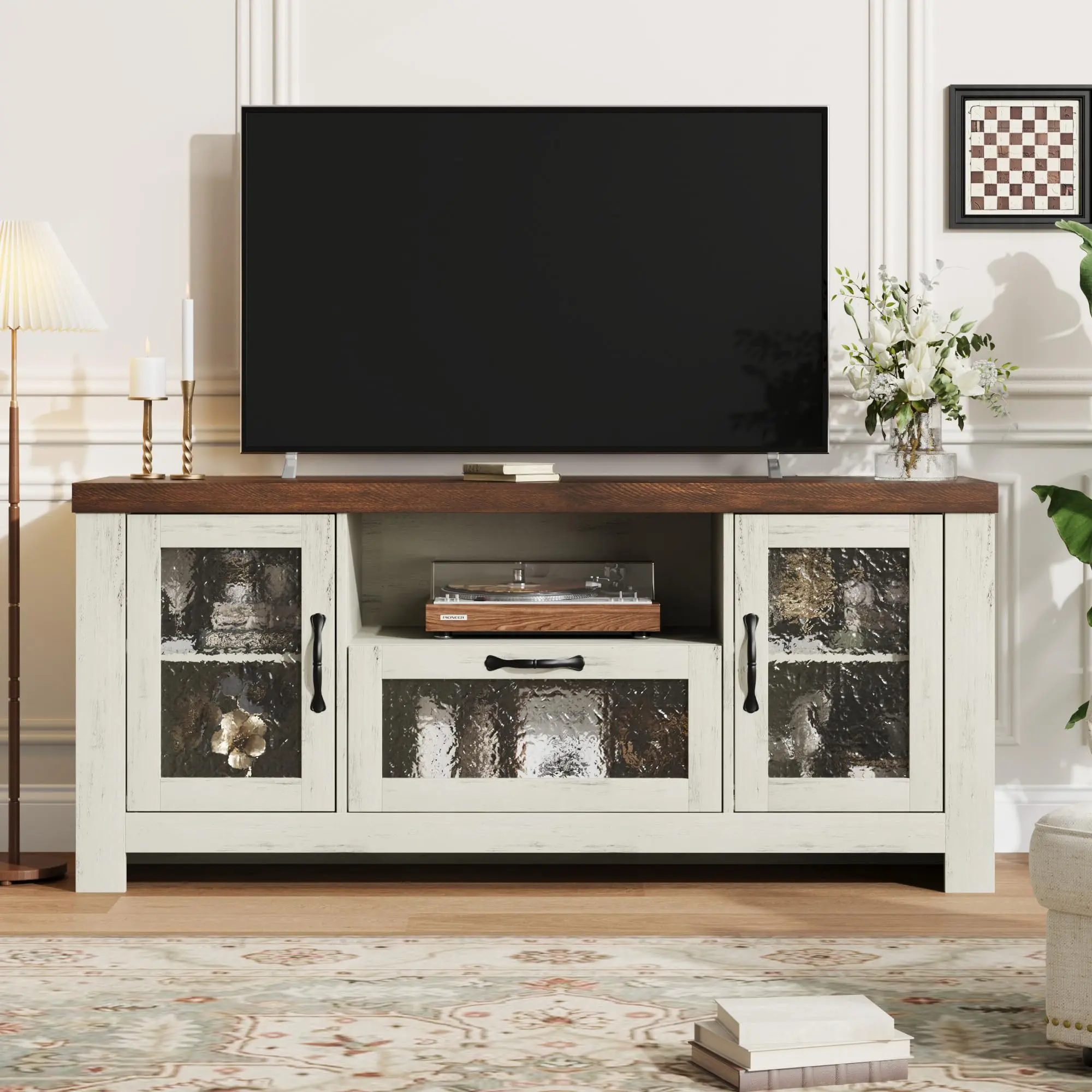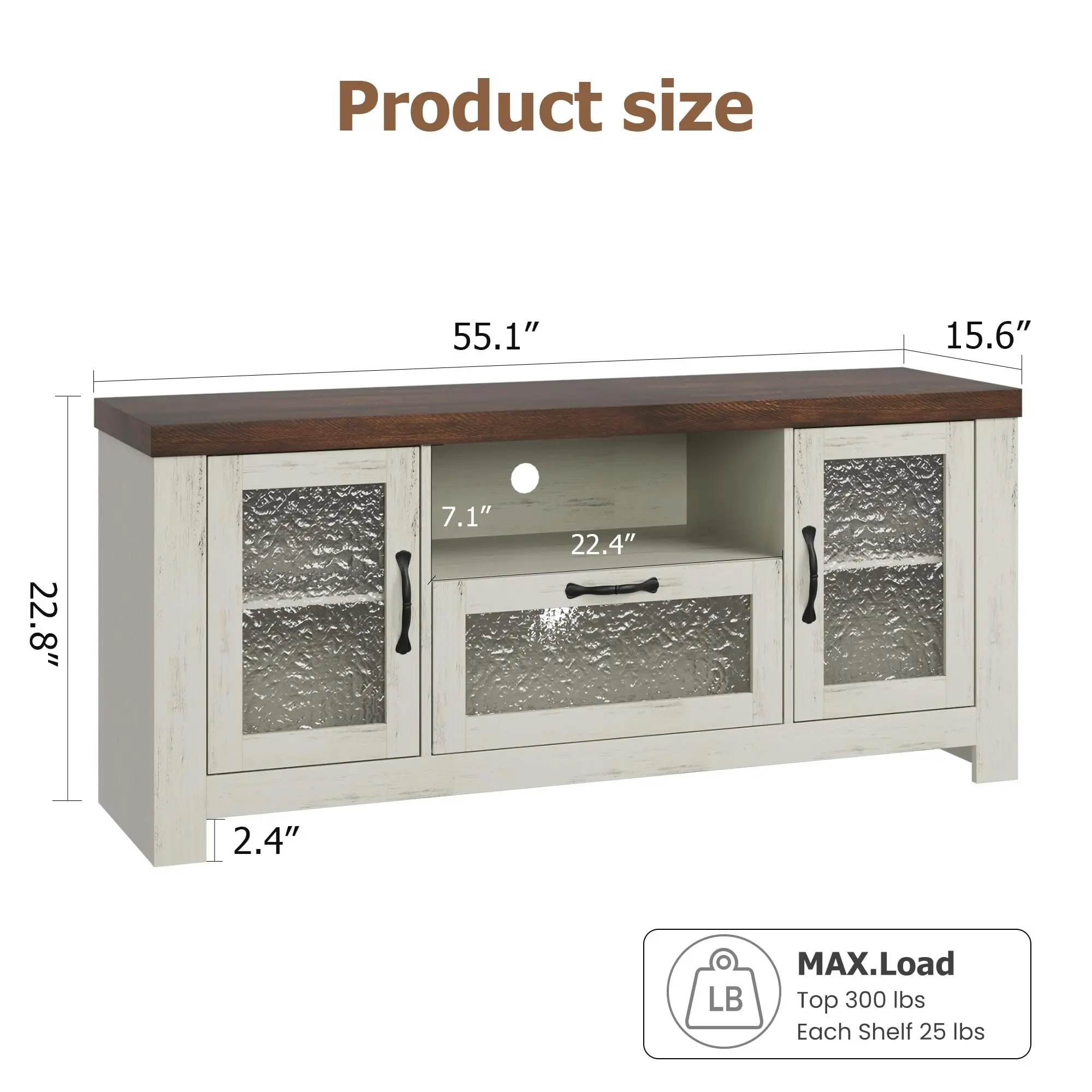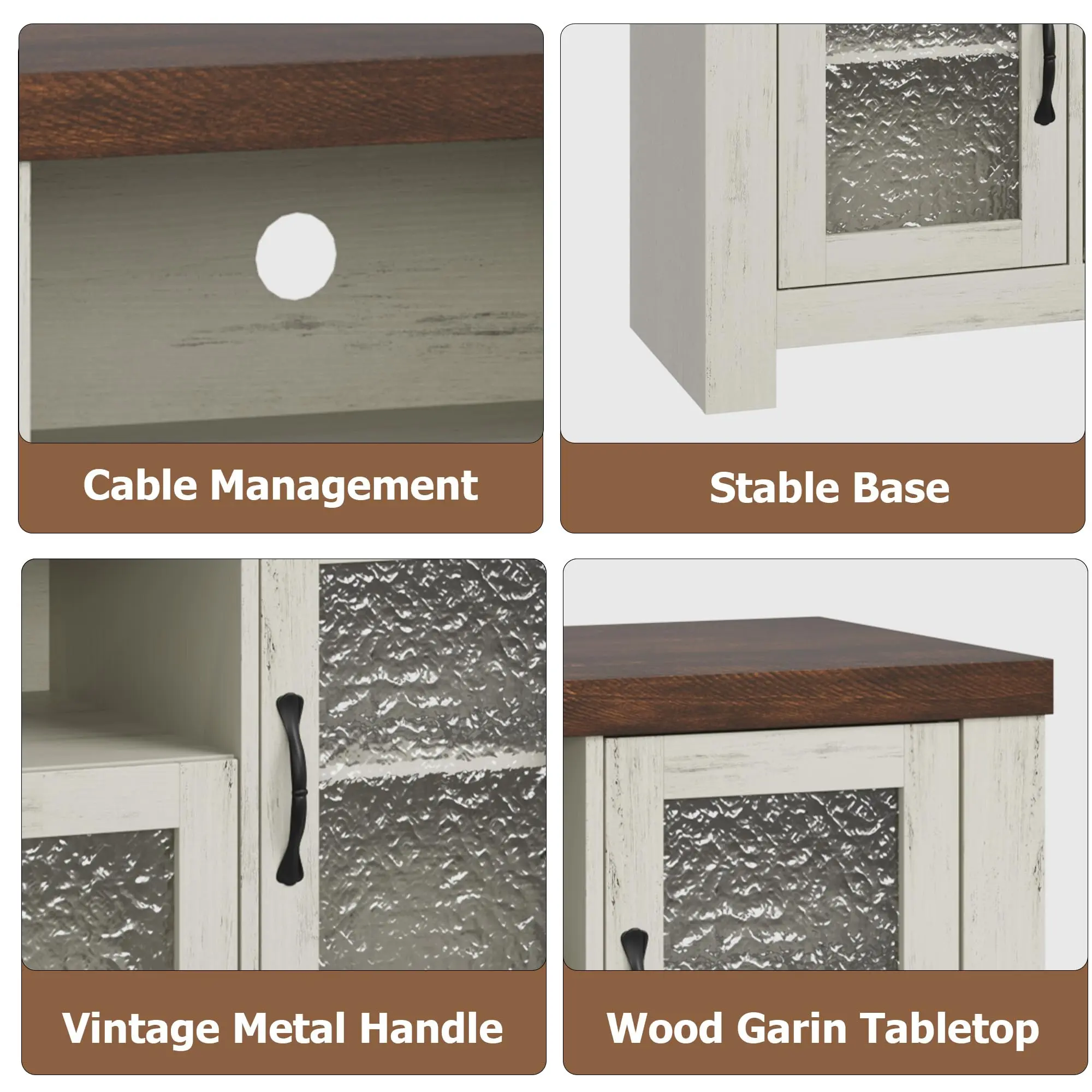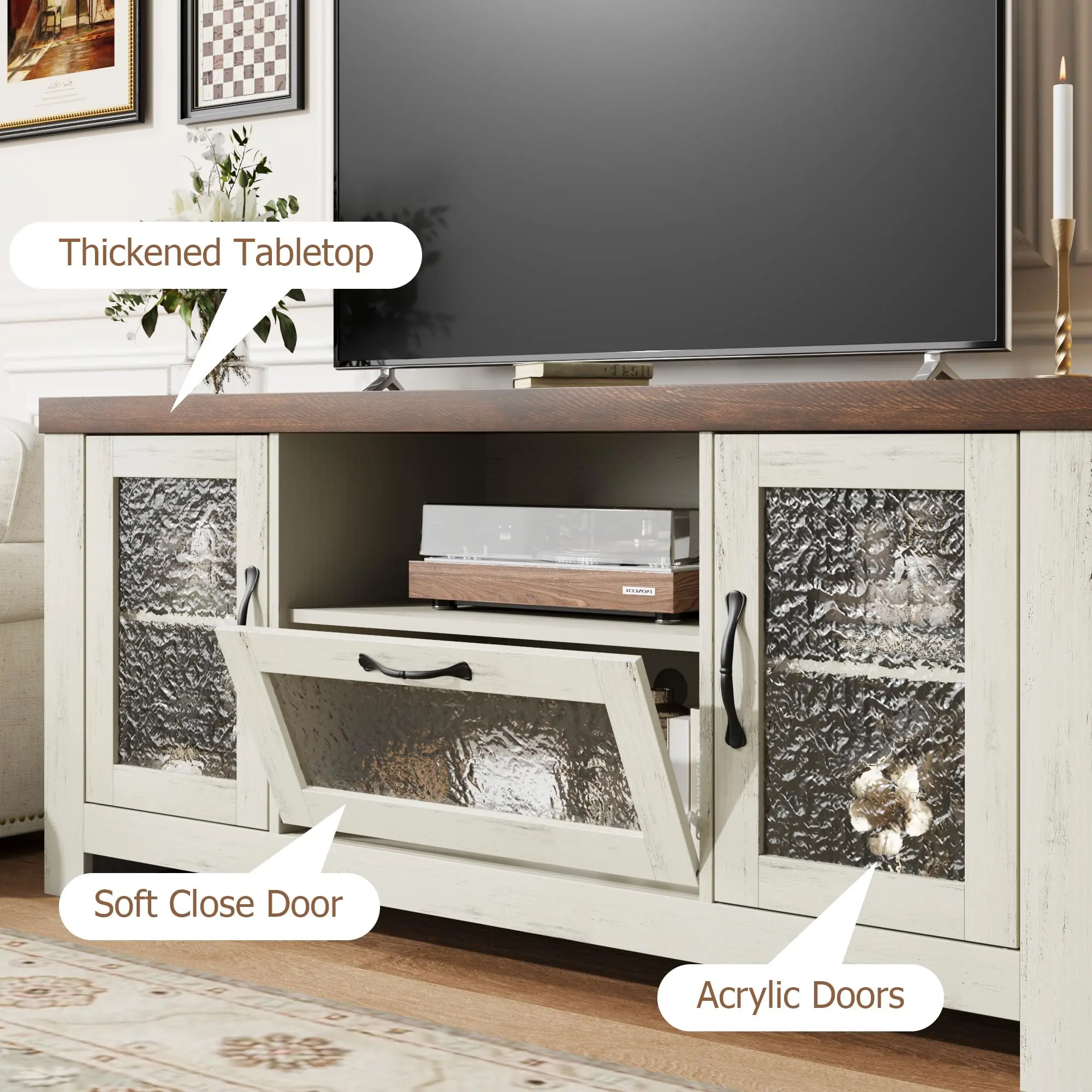 · Efficient Cord Management: Acrylic doors feature a unique textured finish that creates a soft, hazy aesthetic. Paired with oak wood grain, they not only boost storage tidiness but also blend the farmhouse style seamlessly with modern Style