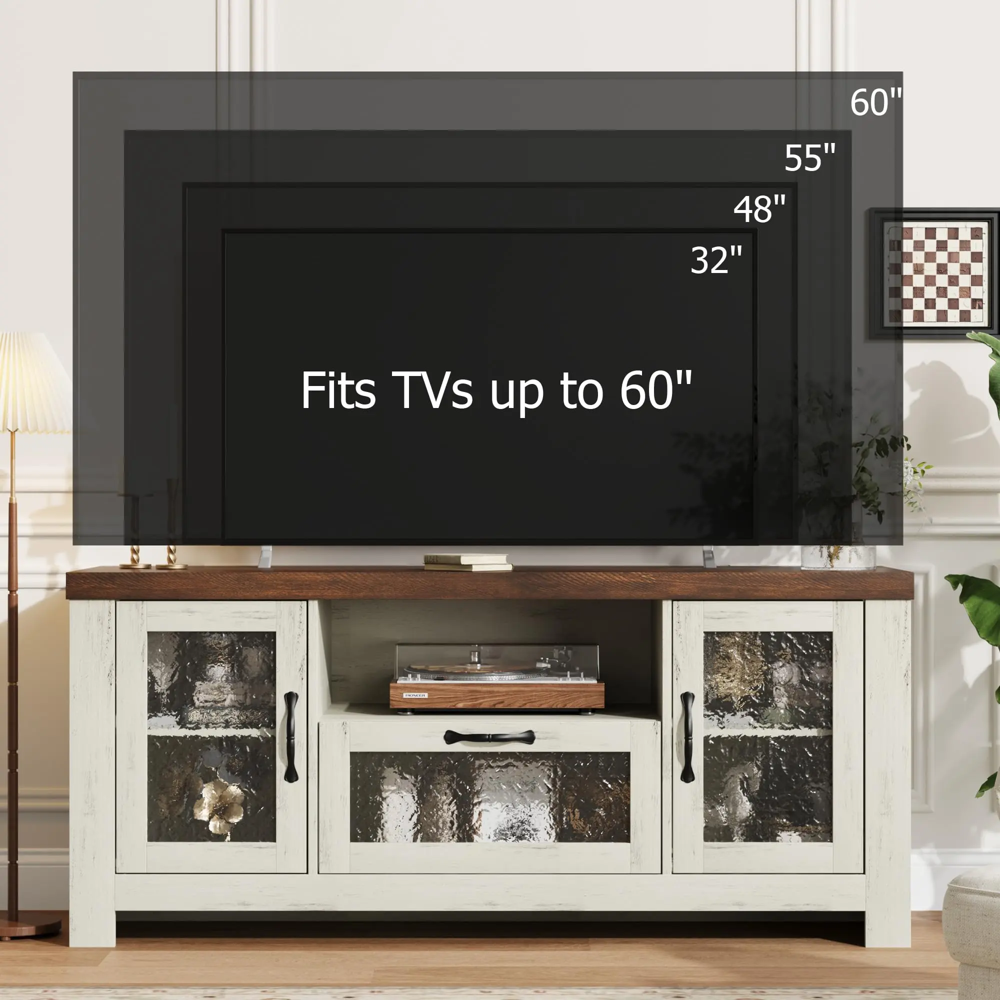 Garvee Farmhouse Entertainment Center TV Stand with Acrylic Door Storage Cabinet and Adjustable Shelves Fits 55-65 Inch Screens in White Brown Black and Rustic Brown for Living Room or Bedroom
