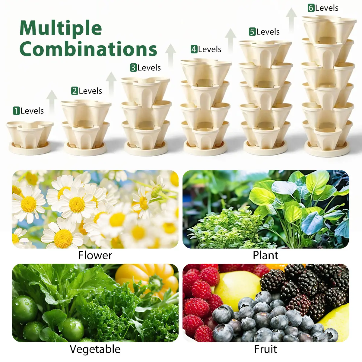 Includes 6 planters, 6 soil separators, and 1 bottom tray. Dimensions: 78.5 cm total height; bottom tray 28 cm in diameter. Effortless stacking without tools. Multi-purpose for indoor and outdoor use. Transform any small space into a lush garden!