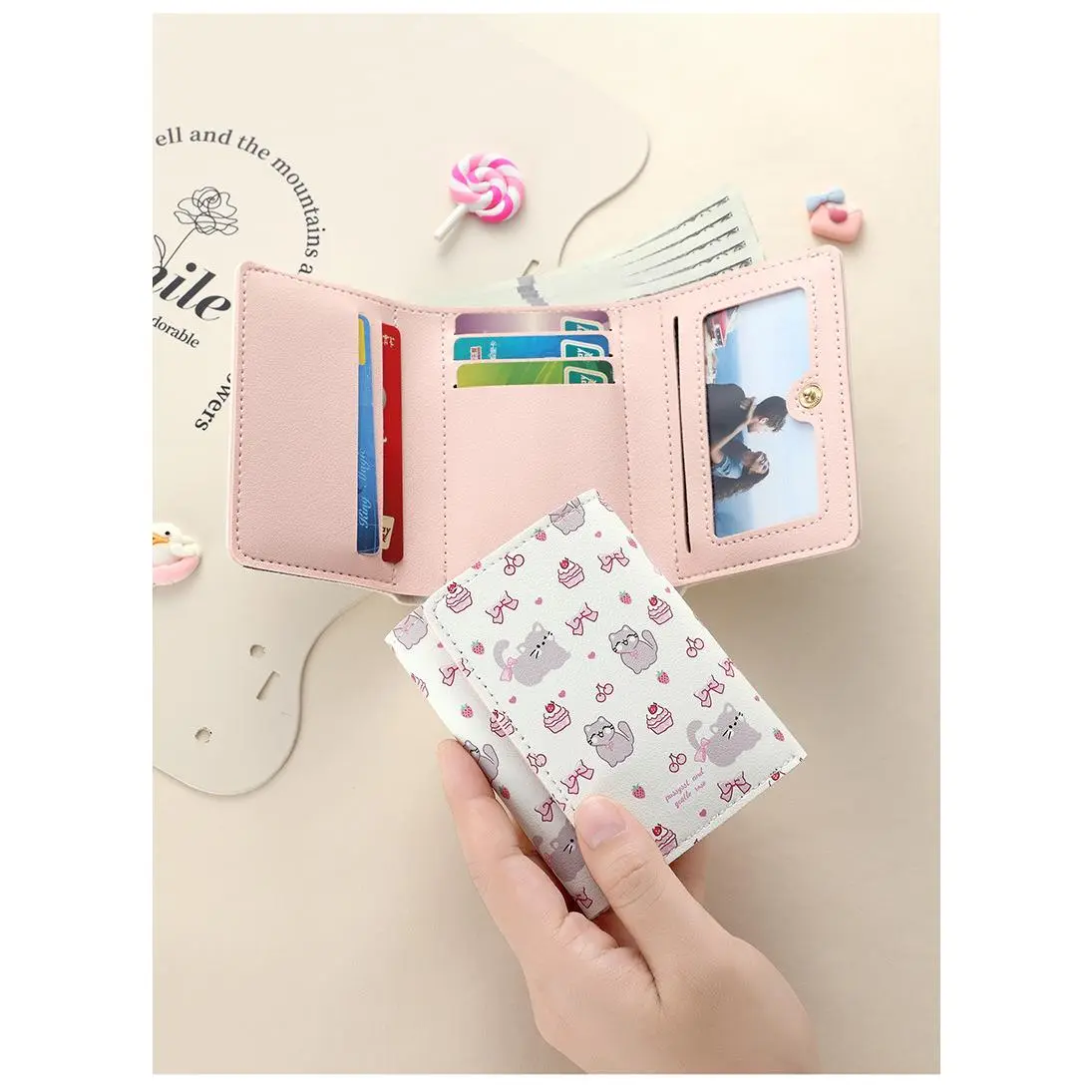 This adorable wallet features a charming Strawberry Bear print, perfect for women who love cute designs. It's a 3-fold short PU leather purse, ideal for everyday carry. The wallet includes card slots and an ID window, making it both functional and stylish. 🐻🍓