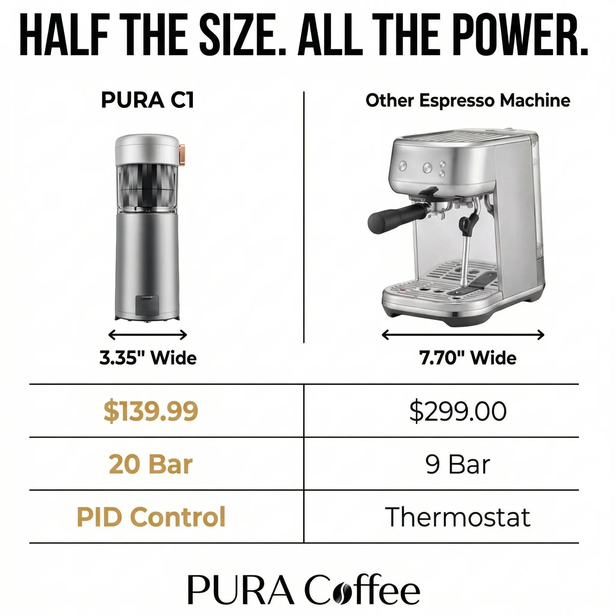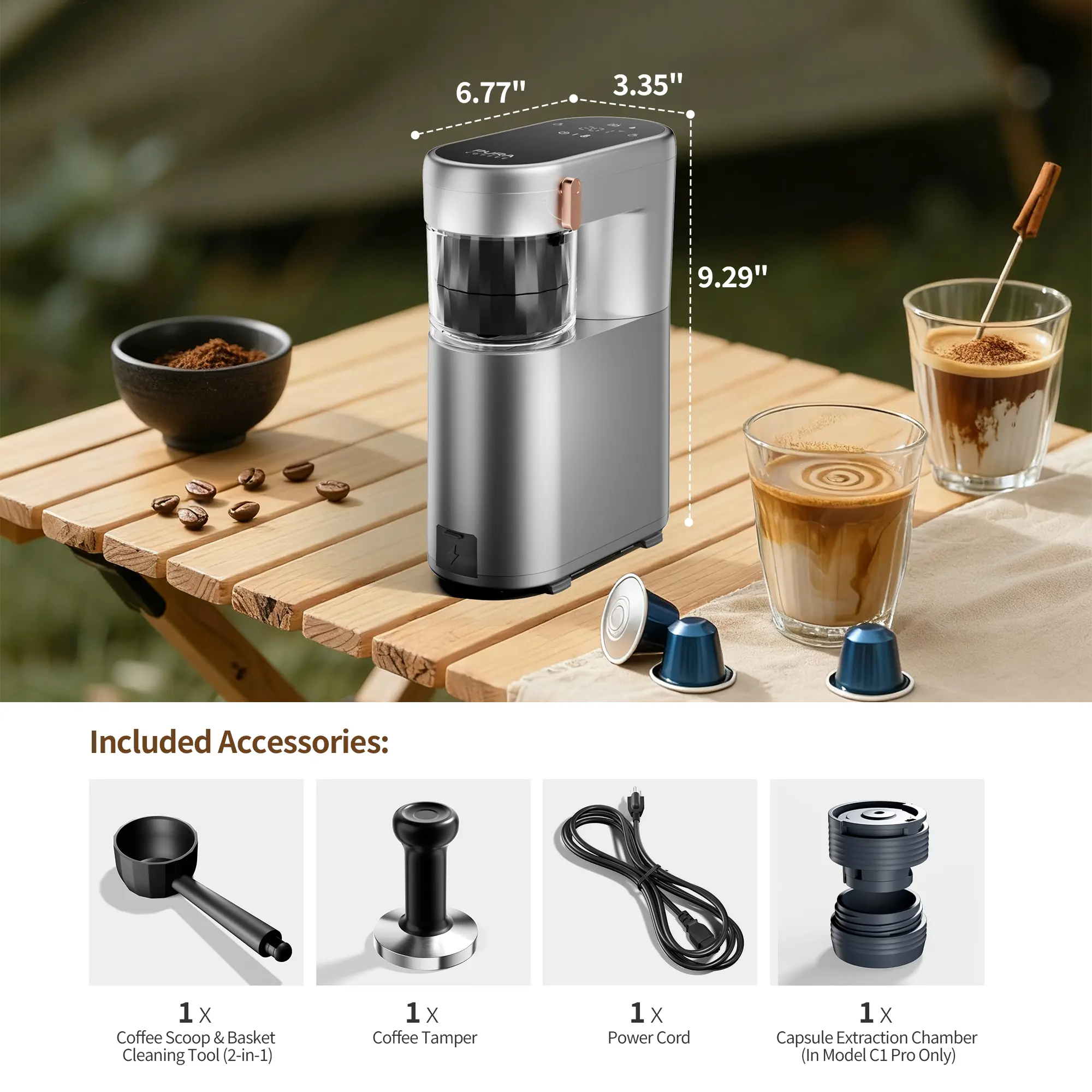 Enjoy professional-grade espresso without the bulk. Small space? No problem. The ultra-compact PCM-C1 (just 6.7"D x 3.4"W x 9.3"H) fits anywhere while delivering big flavor—bridging the gap between cafe quality and on-the-go convenience, delivering "Pure Flavor, Pure Energy" with zero barista skills required.