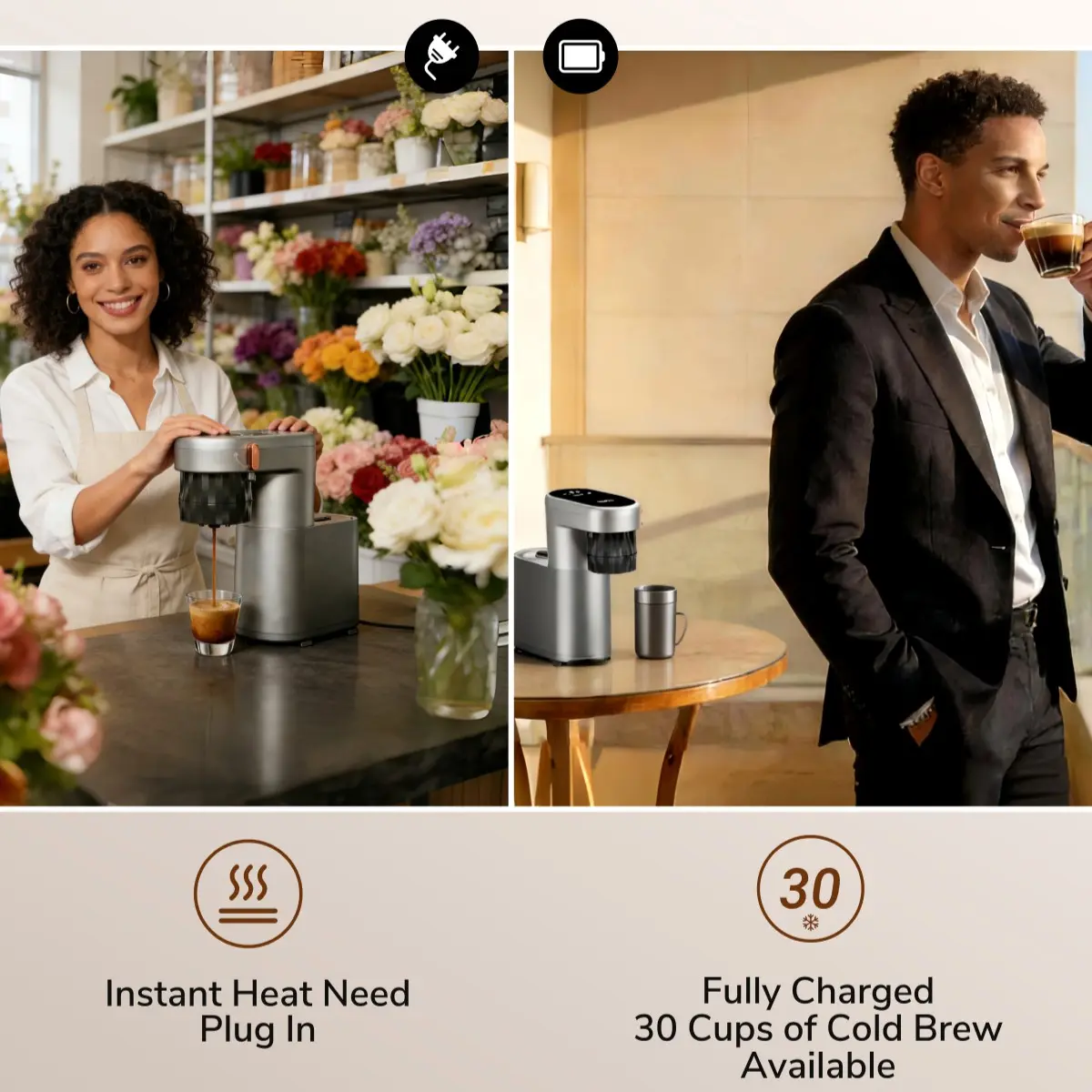 Cordless Freedom & 30-Cup Cold Brew – Important Note: Battery mode brews with room temperature water (ideal for cold brew or if you pre-heat water). For hot coffee, please use AC power or add hot water manually. Ditch the cables! Powered by a built-in battery, you can brew up to 30 cups of cold extraction on a single charge. Enjoy refreshing cold coffee anywhere, no outlet needed.