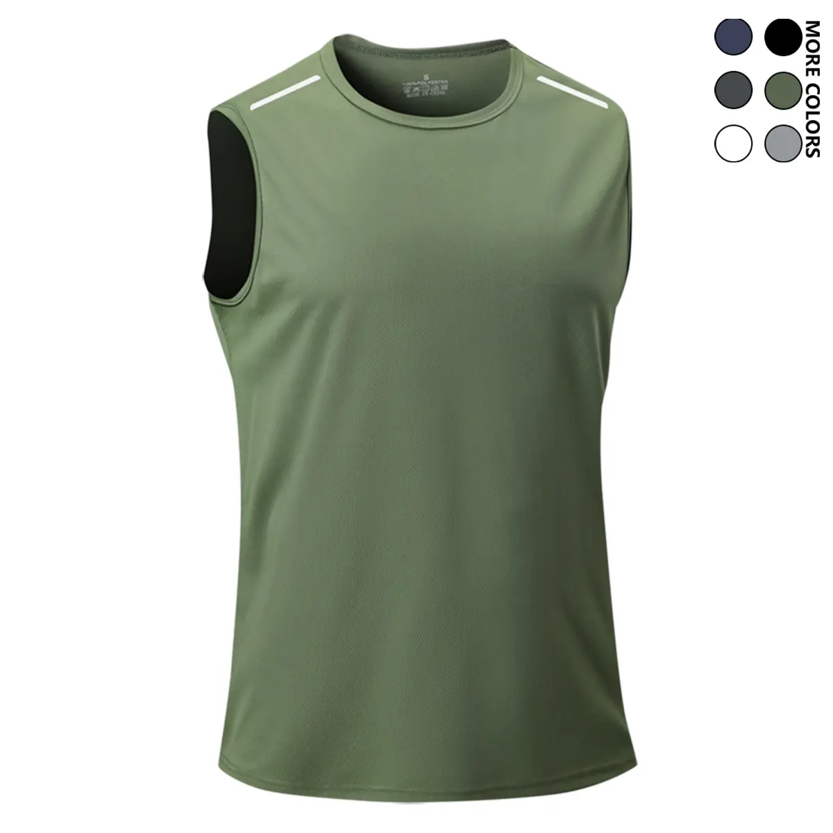 This men's tank top is designed for summer gym, running, and training. It features a crew neck and is made from polyester fiber, ensuring breathability and quick-dry properties. Perfect for athletic wear, it comes in black, white, and navy blue. Stay comfortable and focused during your workouts.