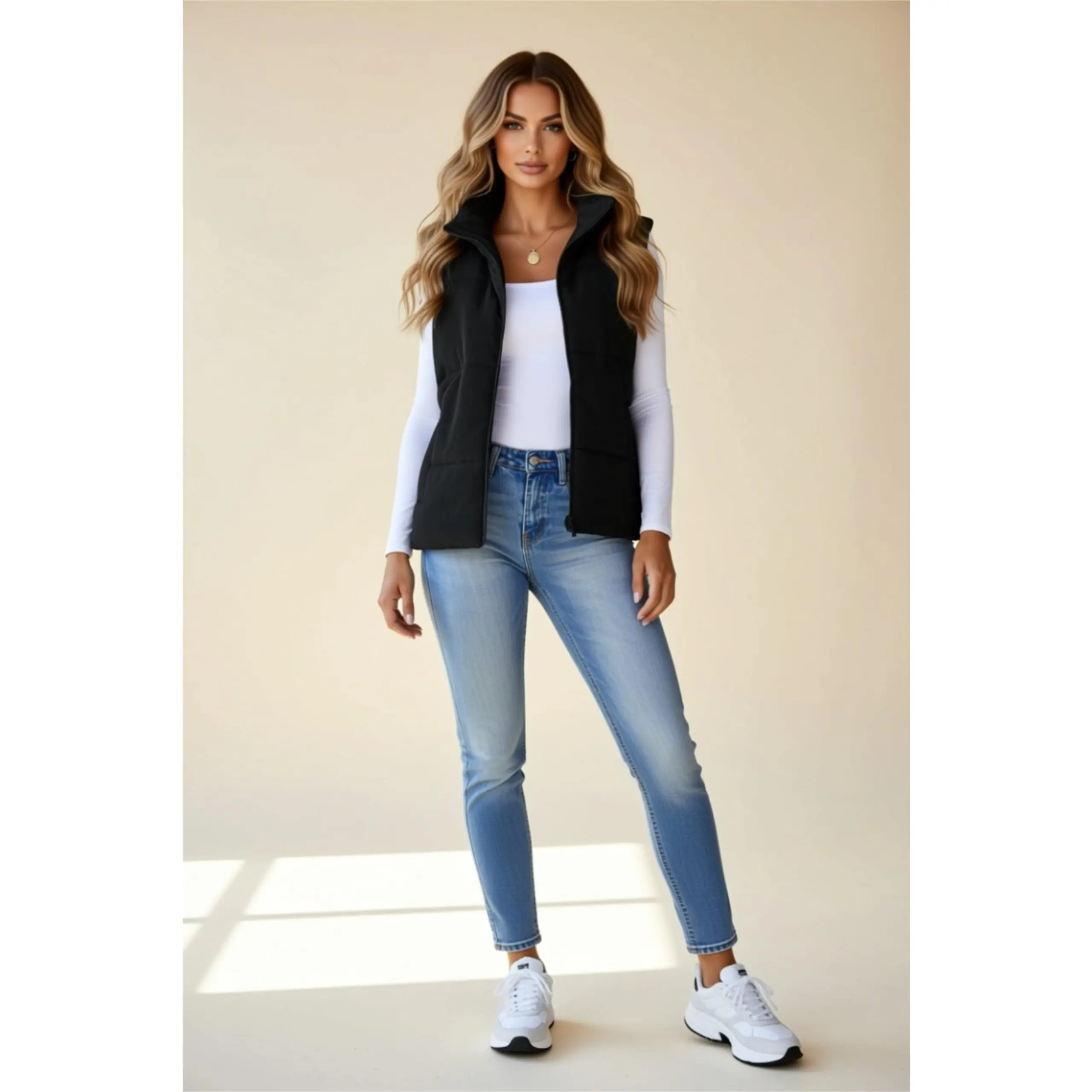 This vest combines practicality with a sleek silhouette, making it ideal for casual outings, travel, or layering over activewear. Pair with jeans and sneakers for an effortlessly chic look.