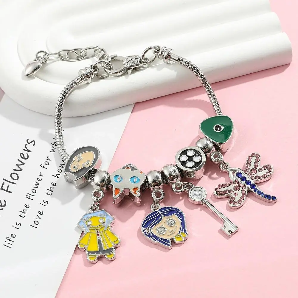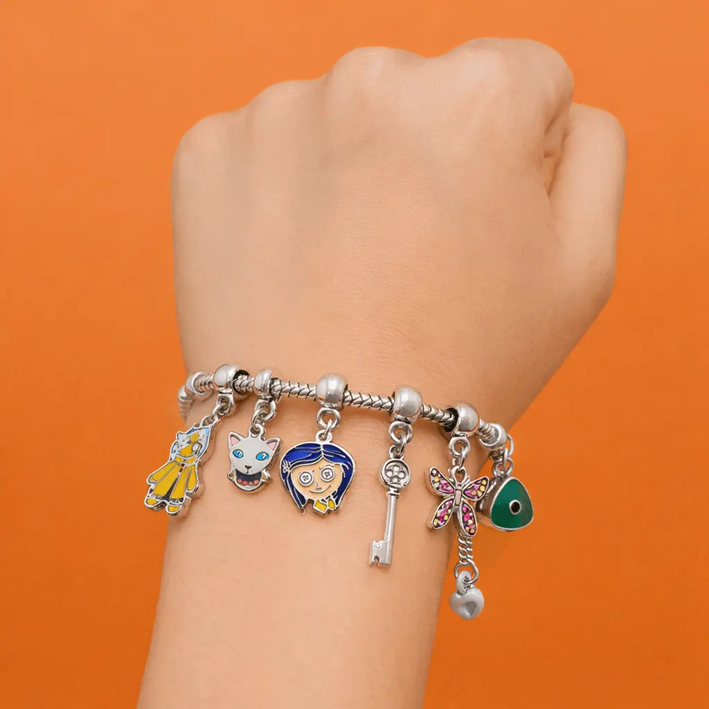 Add a playful and mysterious touch to your style with this Coraline inspired charm bracelet. Featuring colorful enamel pendants and iconic elements like the key and character charms, this bracelet captures a fun and fantasy-inspired look.