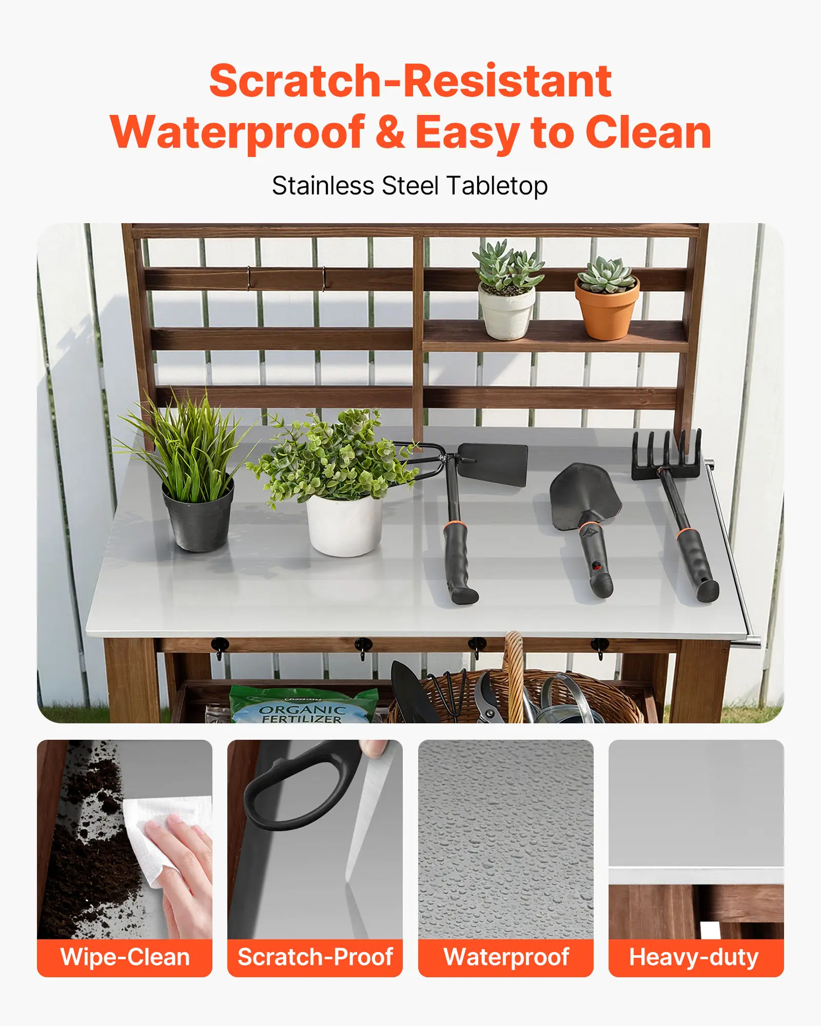 Stainless Steel Tabletop: Our outdoor potting bench resists water and rust, and wipes clean in seconds. Waterproof and built to last, it is ready for heavy tools and everyday garden work