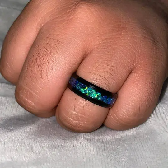 ✨ Unique Design: This comfort fit promise ring features blue and green galaxy opal, offering a distinctive look. Perfect for custom engraving, it's a standout piece. Made from real Tungsten, the opal chips in the outer band add elegance. Each ring's coloring and pattern are unique, ensuring it won't turn green or react to skin.