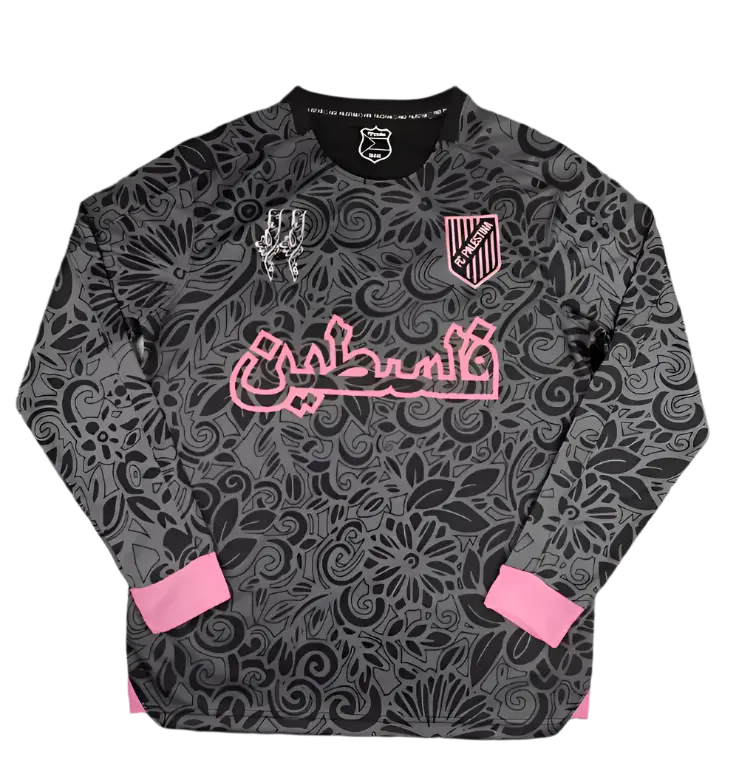 Where culture meets streetwear, the “Thawb & Thunder” jersey redefines resistance with elegance. Set on a deep charcoal base, the all-over print blooms in a swirling floral pattern inspired by traditional Palestinian embroidery (tatreez) — a nod to heritage woven into every thread.